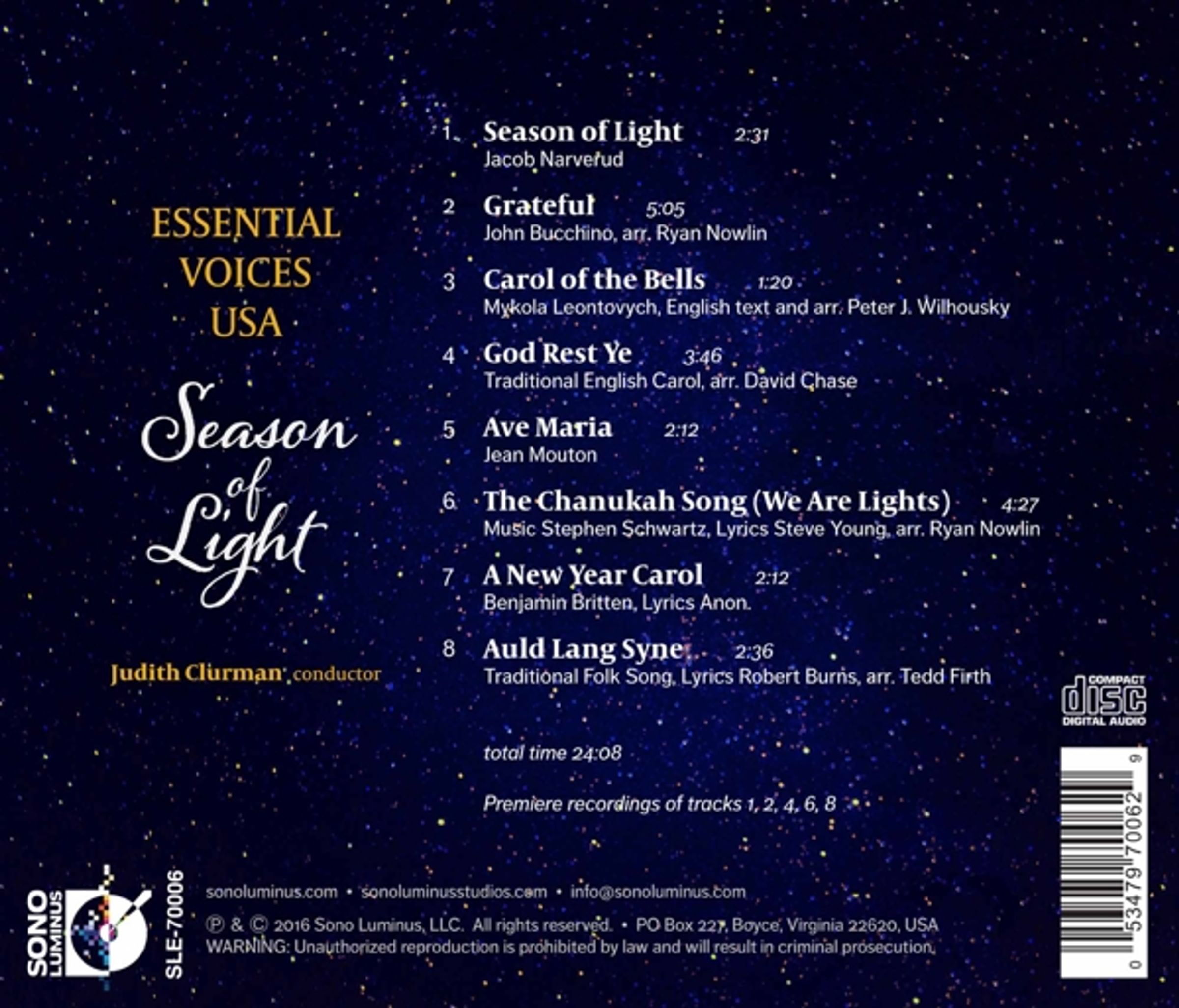 Season of Light; Grateful; Carol of the Bells; God Rest Ye; Ave Maria (Jean Mouton); The Chanukah Song (We Are Lights); A New Year Carol; Auld Lang Syne