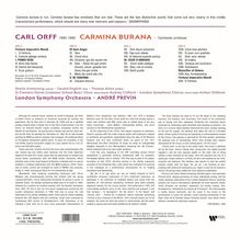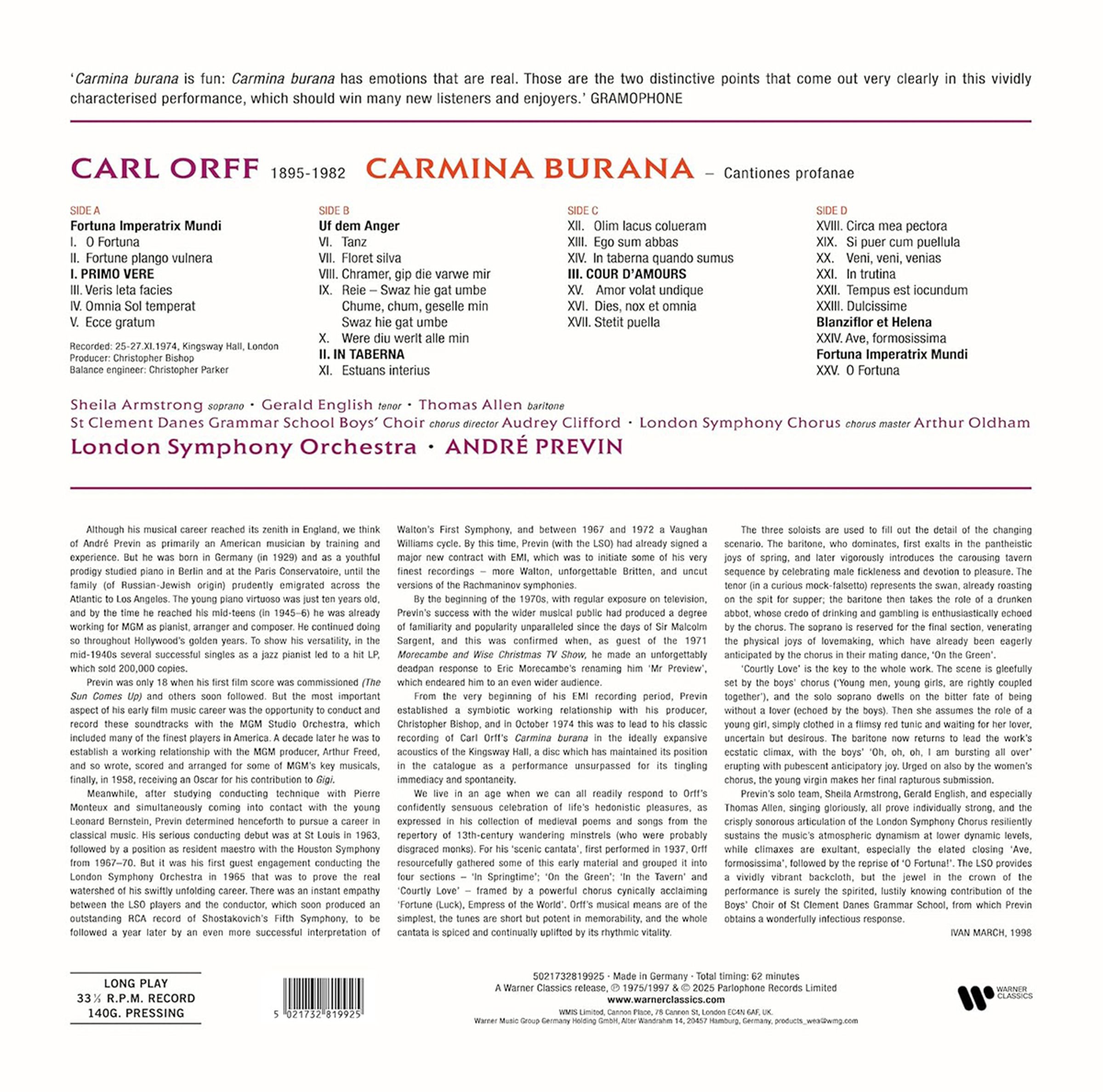 Die 1974 aufgenommene Carmina Burana von André Previn und dem London Symphony Orchestra ist eine der eindringlichsten Versionen des Werkes von Carl Orff. Diese Aufnahme, die als Doppelvinyl in limitierter Auflage erhältlich ist, enthüllt die ganze rhythmische Energie, die Sinnlichkeit und den theatralischen Atem dieses Werks. Die Solisten Sheila Armstrong, Gerald English und Thomas Allen glänzen mit dem London Symphony Chorus und den jungen Stimmen der St. Clement Danes Grammar School durch ihre Ausdruckskraft. Eine intensive und spontane Interpretation!