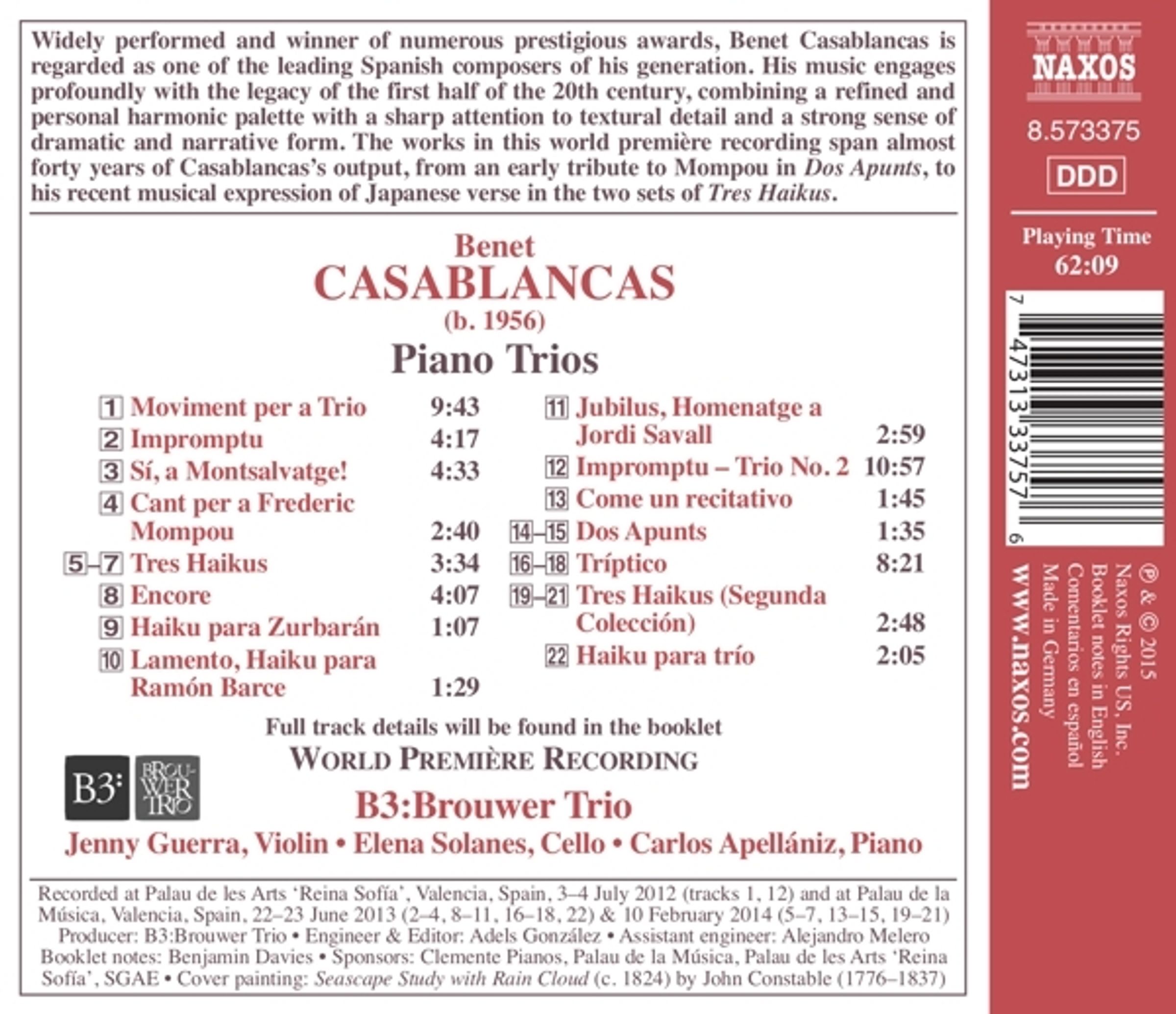 Benet Casablancas wird häufig aufgeführt und hat zahlreiche prestigeträchtige Preise gewonnen. Er gilt als einer der führenden spanischen Komponisten seiner Generation.