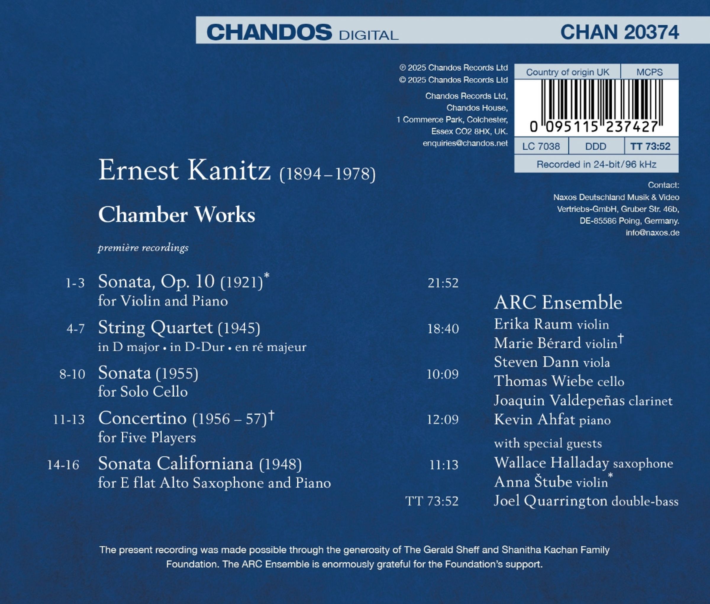 Die Reihe "Music in Exile" des ARC Ensembles wird mit dieser Erkundung der Kammermusikwerke von Ernest Kanitz fortgesetzt. Er wurde 1894 in eine wohlhabende Wiener Familie geboren, von seiner Mutter zur Musik ermutigt, begann im Alter von sieben Jahren mit dem Klavierunterricht und komponierte bereits ein Jahr später. Von seinen Eltern dazu überredet, ein Jurastudium zu absolvieren, studierte Kanitz auch Klavier, Musiktheorie und Komposition (bei Franz Schreker, der auch als Mentor fungierte). Sein Ruf wuchs stetig, seine Werke wurden von Dirigenten wie George Szell und Clemens Krauss gefördert. 1922 erhielt er eine Stelle als Lehrer am Neuen Wiener Konservatorium und gründete 1930 den Wiener Frauenkammerchor, der sich mit seinen Aufführungen von Zoltán Kodály, Arthur Honegger und Igor Strawinsky (sowie Kanitz!) schnell einen Namen in ganz Europa machte. Obwohl Kanitz 1914 zum Christentum konvertiert war, musste er aufgrund seiner jüdischen Abstammung 1938 nach der Annexion Österreichs durch das nationalsozialistische Deutschland seine Heimat verlassen. Nach einem kurzen Aufenthalt in New York zogen Kanitz und seine Frau Gertrude nach Rock Hill in South Carolina, wo er eine Lehrstelle gefunden hatte. Nach Gertrudes frühem Tod durch Krebs zog Kanitz schließlich nach Kalifornien, wo er eine erfolgreiche Lehrkarriere an der University of Southern California aufbaute. Der Eintritt in den Ruhestand von der USC im Jahr 1960 verschaffte ihm viel mehr Zeit für das Komponieren (obwohl er weiterhin unterrichtete und Vorträge hielt), das führte zu erfolgreichen Uraufführungen durch das Philadelphia Orchestra, das Los Angeles Philharmonic und das San Francisco Symphony Orchestra, um nur einige zu nennen. Nach seinem Tod im Jahr 1978 geriet seine Musik, wie die so vieler emigrierter Komponisten, in Vergessenheit.