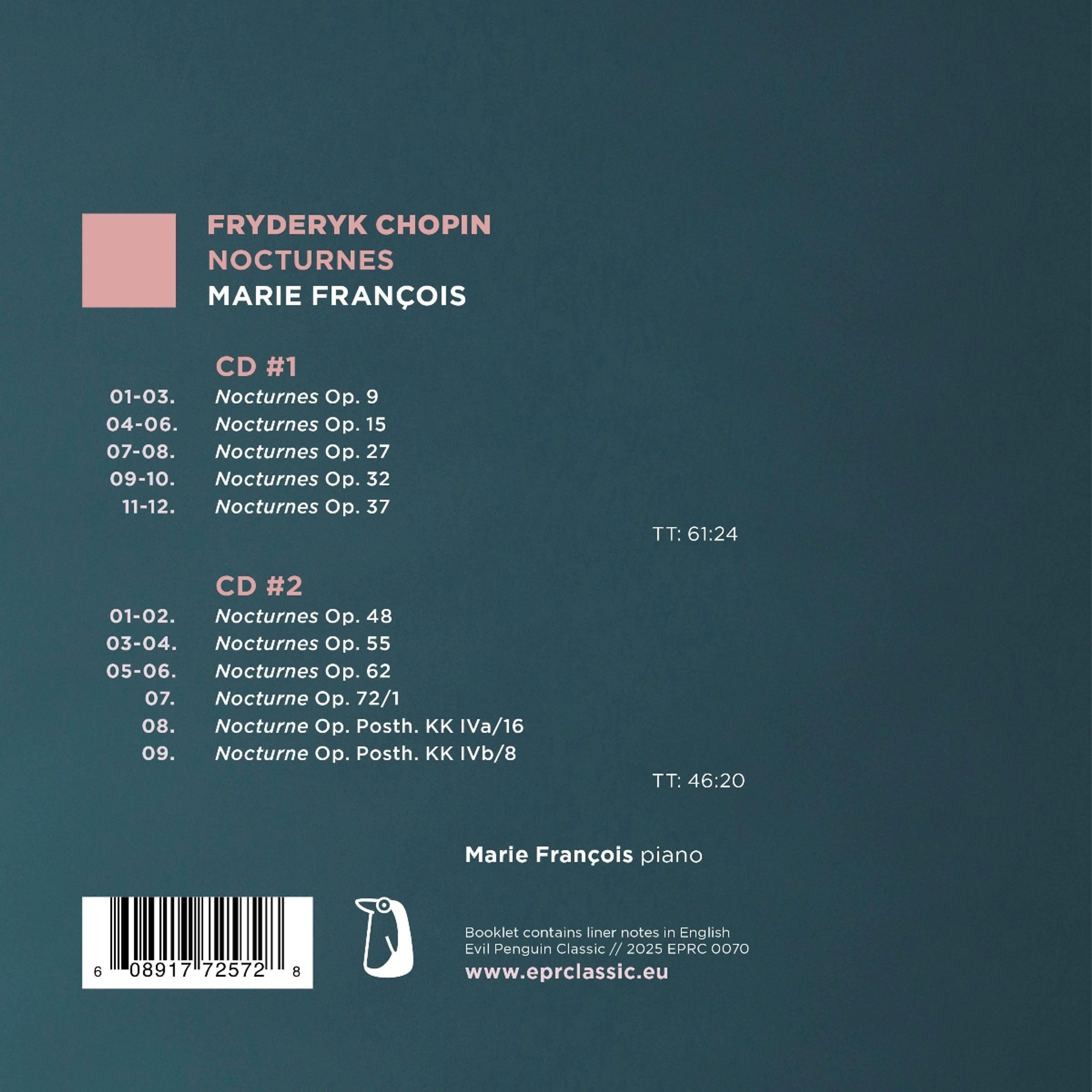 Die belgische Pianistin Marie François präsentiert auf diesem Album sämtlich Nocturnes von Frédéric Chopin. Sie erklärt: „Chopins Nocturnes gelten weithin als einige der besten Werke für Solo-Klavier und nehmen auch heute noch einen herausragenden Platz im Konzertrepertoire ein. Er komponierte zwischen 1827 und 1846 insgesamt 21 davon, die zu einem zentralen Bestandteil des Repertoires geworden sind. Viele seiner Kompositionen entstanden als Improvisationen – musikalische Ideen, die er am Klavier entdeckte und später sorgfältig zu schriftlichen Werken ausarbeitete. Es gibt noch so viel mehr darüber zu sagen – aber für mich war es zum Teil das langjährige Studium und Spielen, durch das ich sie besser verstanden habe. Von Anfang an war es nie mein Ziel, diese Nocturnes einfach nur aufzunehmen. Ich wollte als Pianistin und vor allem als Musikerin lernen und wachsen. Ich wollte verstehen, wie man mit dem Instrument Geschichten erzählt, wie man durch Phrasierung, Klangfarbe, Timing und Stille eine musikalische Erzählung schafft. Und dafür gibt es kein besseres Repertoire als diese Nocturnes.“ Marie François, die regelmäßig bei Konzerten und Festivals in Europa und den USA auftritt, ist die erste Classical-Yamaha-Künstlerin der Benelux-Staaten.