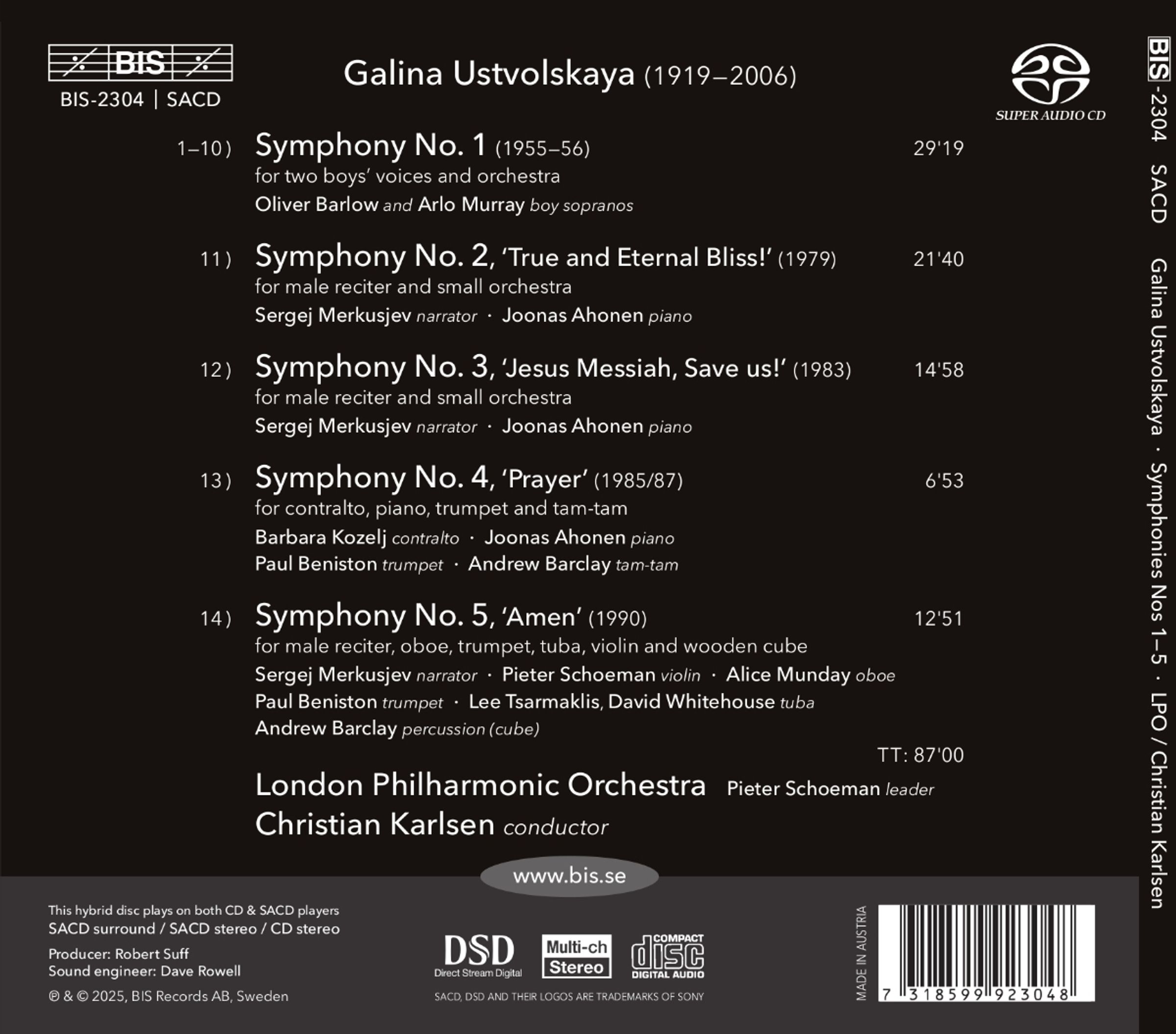 Christian Karlsen und das London Philharmonic Orchestra präsentieren hier Ustvolskayas fünf Sinfonien. Während die erste oberflächlich betrachtet traditionell erscheint (sie ist die einzige für ein volles Sinfonieorchester), singen zwei Jungen – über Mikrofone, in einer chantartigen Weise – Texte, die von Armut, Rassismus und Ungerechtigkeit handeln. Die Sinfonien Nr. 2 bis 5 brechen entscheidend mit der traditionellen Form; jede besteht aus einem einzigen, eher kurzen Satz, ähnlich wie bei theatralischen Ritualen. Diese Sinfonien, die für ebenso vielfältige wie ungewöhnliche Instrumentenkombinationen konzipiert sind, wurden immer kompromissloser, je weiter sich ihre Instrumentierung verkleinerte, bis hin zu nur noch einer Handvoll Instrumenten in der vierten und fünften Sinfonie. Sporadisch taucht eine Solostimme auf, nicht unbedingt mit Gesang, sondern eher, um ein Gebet zu verbalisieren – ein Gebet, das um Vergebung bittet, aber nicht um ein besseres Leben.