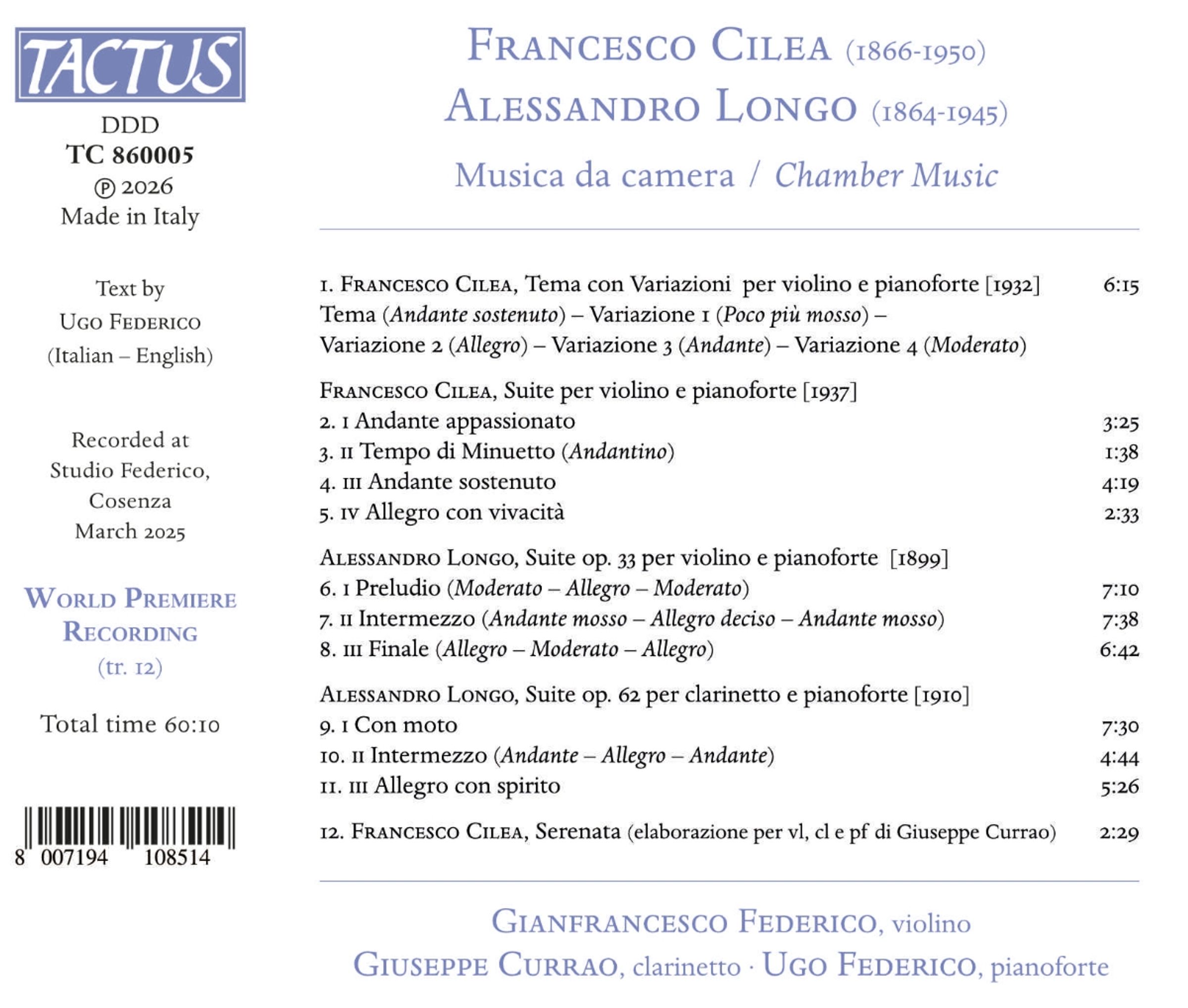 Die Veröffentlichung der auf diesem Album enthaltenen Stücke hat zum Ziel, ein weniger bekanntes Kammermusikrepertoire unter den Konzertbesuchern zu fördern und zu verbreiten: ein Repertoire, das aufgrund seiner Originalität zweifellos in jeder Epoche eine kulturelle und musikalische Wertschätzung verdient. Die beiden Komponisten, die in dieser Ausgabe vertreten sind, bedürfen keiner Vorstellung: Francesco Cilea, der der Operntradition und dem Belcanto verbunden ist und berühmte Opern wie "L'Arlesiana" und "Adriana Lecouvreur" komponiert hat, und Alessandro Longo, der als erster alle 555 Cembalosonaten von Domenico Scarlatti überarbeitet hat und Autor der bekannten 12-bändigen "Tecnica Pianistica" ist. Longo war auch der Gründer der renommierten neapolitanischen Musikzeitschrift "L'Arte Pianistica".