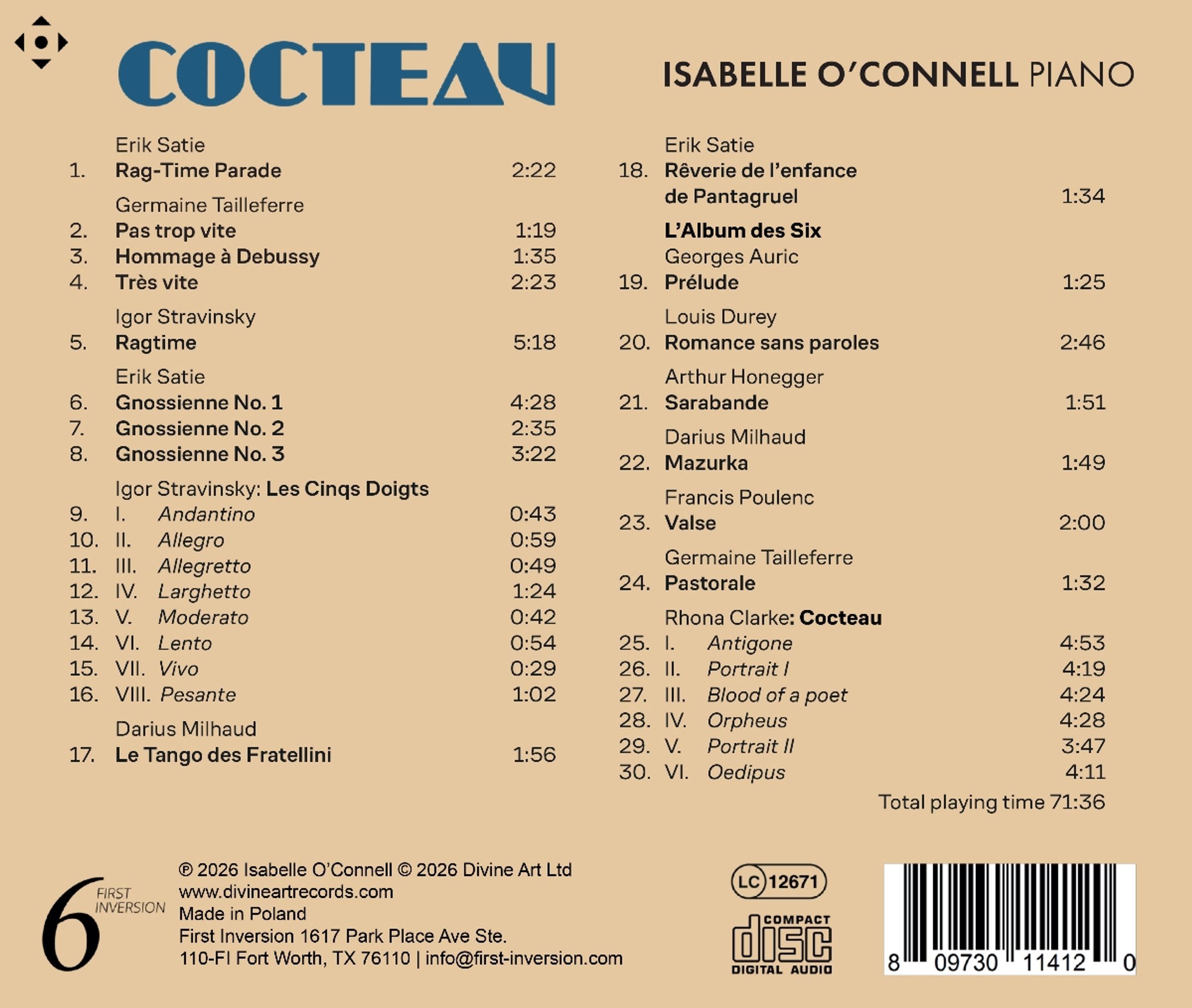 Auf ihrem Album "Cocteau" erkundet Isabelle O'Connell die musikalischen Bezüge und den künstlerischen Geist des vielseitigen und einflussreichen französischen Künstlers, Filmemachers, Romanciers und Dichters Jean Cocteau (1889-1963). Im Laufe seines Lebens arbeitete Cocteau mit den legendären Ballets Russes zusammen, war an bedeutenden Kunstbewegungen wie dem Kubismus und dem Surrealismus beteiligt und zählte zu den wichtigsten frühen Avantgarde-Regisseuren des Kinos. O'Connells "Cocteau" zentriert sich um das brandneue Werk "Cocteau" der irischen Komponistin Rhona Clarke, das eigens für O'Connell geschrieben wurde. Es erklingt nach der Musik von Cocteaus Zeitgenossen und Weggefährten im Paris vor einem Jahrhundert. Dabei hört man Musik von Erik Satie, Igor Strawinsky, Darius Milhaud sowie den Mitgliedern der "Groupe des Six" (Georges Auric, Louis Durey, Arthur Honegger, Darius Milhaud, Francis Poulenc, Germaine Tailleferre), für die Cocteau eine Galionsfigur war.