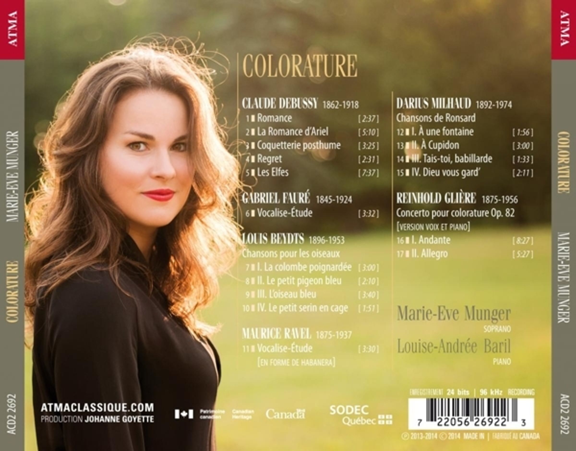 Vom selten aufgenommenen Zyklus Chanson pour les oiseaux von Louis Beydts über frühe Melodien von Claude Debussy bietet Marie-Eve Munger ein originelles Repertoire mit Abstechern zu einigen vokalartigen Stücken von Glière, Fauré und Ravel. Frau Munger wird am Klavier von der Pianistin Louise-Andrée Baril begleitet.