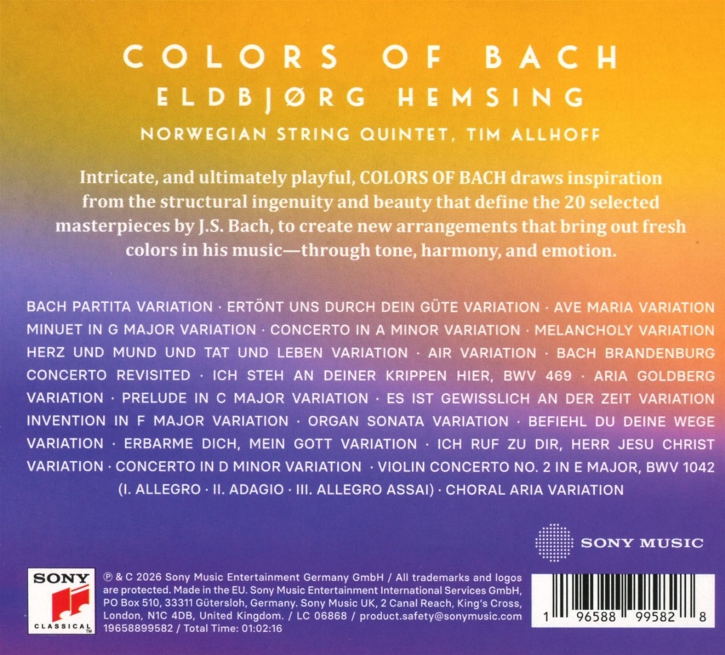 Auf ihrem neuen Album COLORS OF BACH lässt Violinistin Eldbjörg Hemsing die ausdrucksstarke Musik von Johann Sebastian Bachs in völlig neuen Arrangements erklingen und eröffnet zeitgenössische Perspektiven auf sein Werk. Vielschichtig, fein nuanciert und mit ungezügelter Spielfreude, schöpft das Album seine Inspiration aus der strukturellen Raffinesse und der expressiven Schönheit von zwanzig ausgewählten Werken. Die renommierten Arrangeure Tim Allhoff, Jan-Peter Klöpfel und Jarkko Riihimäki rücken bekannte Meisterwerke durch buchstäblich neue „Farben“, die in Bachs Musik eingeführt werden – durch Klang, Harmonie und Emotion – in neues Licht. Im Zentrum des Projekts steht eine gemeinsame künstlerische Philosophie: Bachs Musik zu erweitern, neu zu denken und zu formen – ohne sie zu verfälschen. Die Arrangeure schöpfen ihre Inspiration aus der positiven und universellen Kraft seiner Themen und Harmonien und bewahren dabei die innere Zuversicht, die Bachs Werk so einzigartig macht. Von der verspielten Brillanz der Partita Variation bis zur tief berührenden Neuinterpretation von Bachs Brandenburgischem Konzert – ikonische Melodien erhalten neue Vitalität, eröffnen emotionale Dimensionen, bewahren aber zugleich größten Respekt vor den originalen Meisterwerken. Die dichte, melodische Gestaltung des Orgelpräludiums in C-Dur geht nahtlos in eine virtuose Fassung für Solovioline und Streichorchester über und schafft ein fesselndes Hörerlebnis. Air nimmt die Eleganz eines italienischen Konzerts an, während das geliebte Erbarme Dich aus der Matthäuspassion als intime instrumentale Ballade neu erstrahlt. Gemeinsam zeigen diese kreativen Arrangements die Wandlungsfähigkeit und Zeitlosigkeit von Bachs Musik – und entfalten ein eindrucksvolles Kaleidoskop musikalischer Farben. „Bach ist so ein genialer Komponist“, reflektiert Eldbjörg Hemsing, „dass es unendlich viele Möglichkeiten gibt, seine Formen und Strukturen zu betrachten. Jede Melodie, die er geschrieben hat, vereint auf faszinierende Weise technische Präzision und tiefes Gefühl – und genau darin liegt die unerschöpfliche Vielfalt seiner Musik.“ COLORS OF BACH ist eine Hommage an diese zeitlose Musikalität – eine Einladung an die Hörerinnen und Hörer, Bachs Werke auf spielerische Weise neu zu entdecken. Im Herzen des Albums stehen Freude, Hoffnung und ein Sinn für Leichtigkeit. „Wir wollten dem Publikum die Möglichkeit geben, sich mit diesen bedeutenden Werken der Musikgeschichte neu zu verbinden“, sagt Eldbjörg. „Und vielleicht dabei auch ihre ganz persönliche Interpretation zu entdecken.“ Eines der emotionalsten Arrangements des Albums ist Air. Das Stück, das oft mit Abschied und Trauer in Verbindung gebracht wird, hat für Eldbjörg eine tief persönliche Bedeutung: „Dieses Werk ist eines der wichtigsten, die ich je gespielt habe“, erzählt sie. „Es wurde bei der Beerdigung meines Vaters aufgeführt, und ich habe es lange mit dem Schmerz des Verlustes verbunden. Aber so wollte ich ihn nicht in Erinnerung behalten. Musik hat die Kraft, unsere Emotionen zu lenken – und indem ich diesem Stück eine neue Perspektive gebe, kann ich selbst entscheiden, wie ich mich damit verbinden möchte. Genau das ist der Geist dieses Albums.“ COLORS OF BACH bildet eine Brücke zwischen Vergangenheit und Gegenwart. Mit seinen überraschenden Momenten, facettenreichen Klangbildern und tief empfundenen Arrangements lädt das Album sowohl neue als auch erfahrene Hörerinnen und Hörer ein, die unendlichen Farben in Bachs Musik neu zu entdecken. COLORS OF BACH wurde im Studio der Oslo Opera aufgenommen – mit einem hochkarätigen Ensemble aus einigen der besten Streicher: innen der Stadt: Elise Båtnes, 1. Violine; Liv Hilde Klokk-Bryhn und Maria Carlsen, 2. Violinen; Ida Bryhn, Viola; Louisa Tuck, Cello; Kenneth Ryland, Kontrabass. Tim Allhoff ist am Klavier zu hören, Christian Kjos am Cembalo.