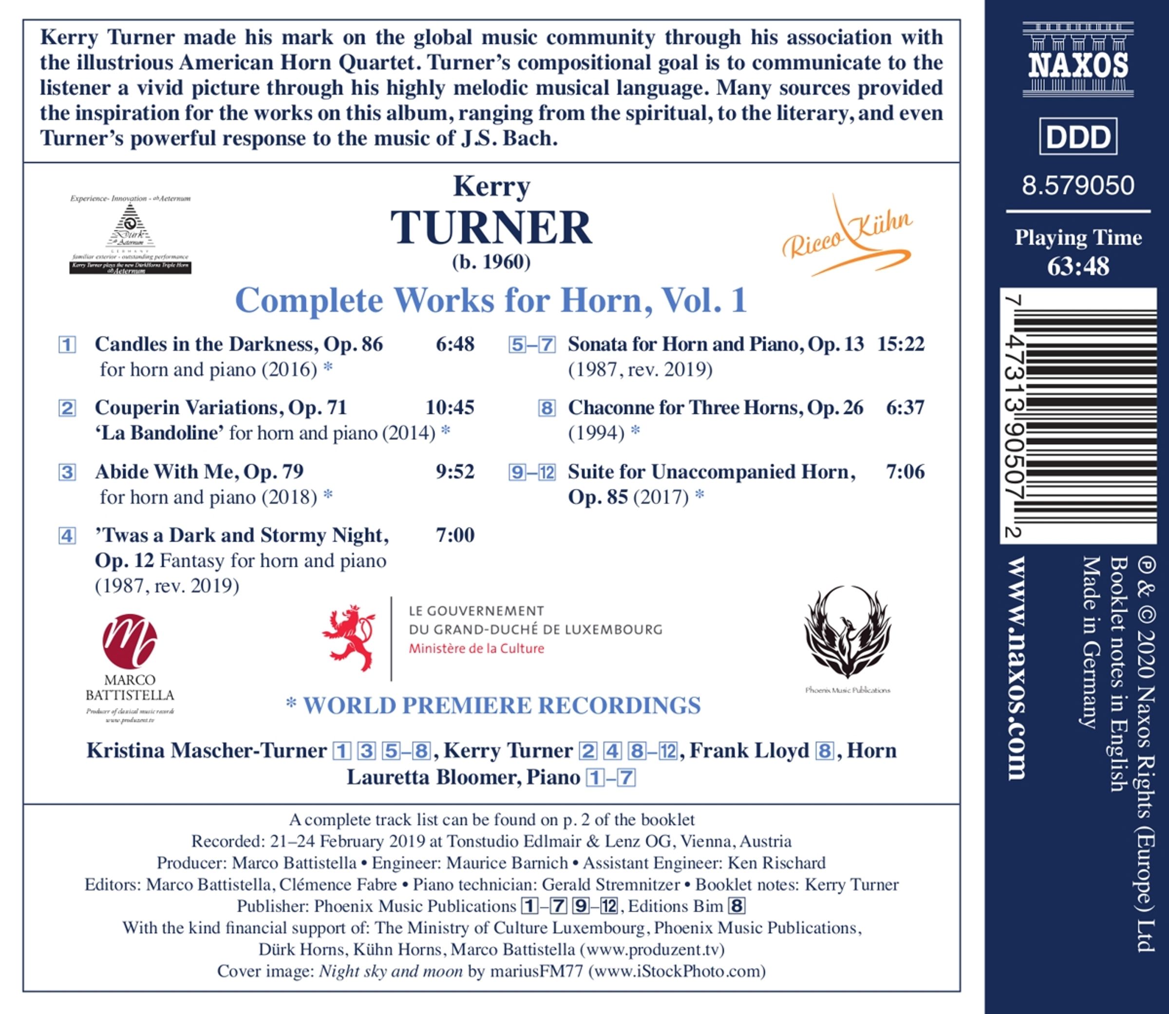 Kerry Turner made his mark on the global music community through his association with the illustrious American Horn Quartet. Turner’s compositional goal is to communicate to the listener a vivid picture through his highly melodic musical language. Many sources provided the inspiration for the works on this album, ranging from the spiritual, to the literary, and even Turner’s powerful response to the music of J. S. Bach.