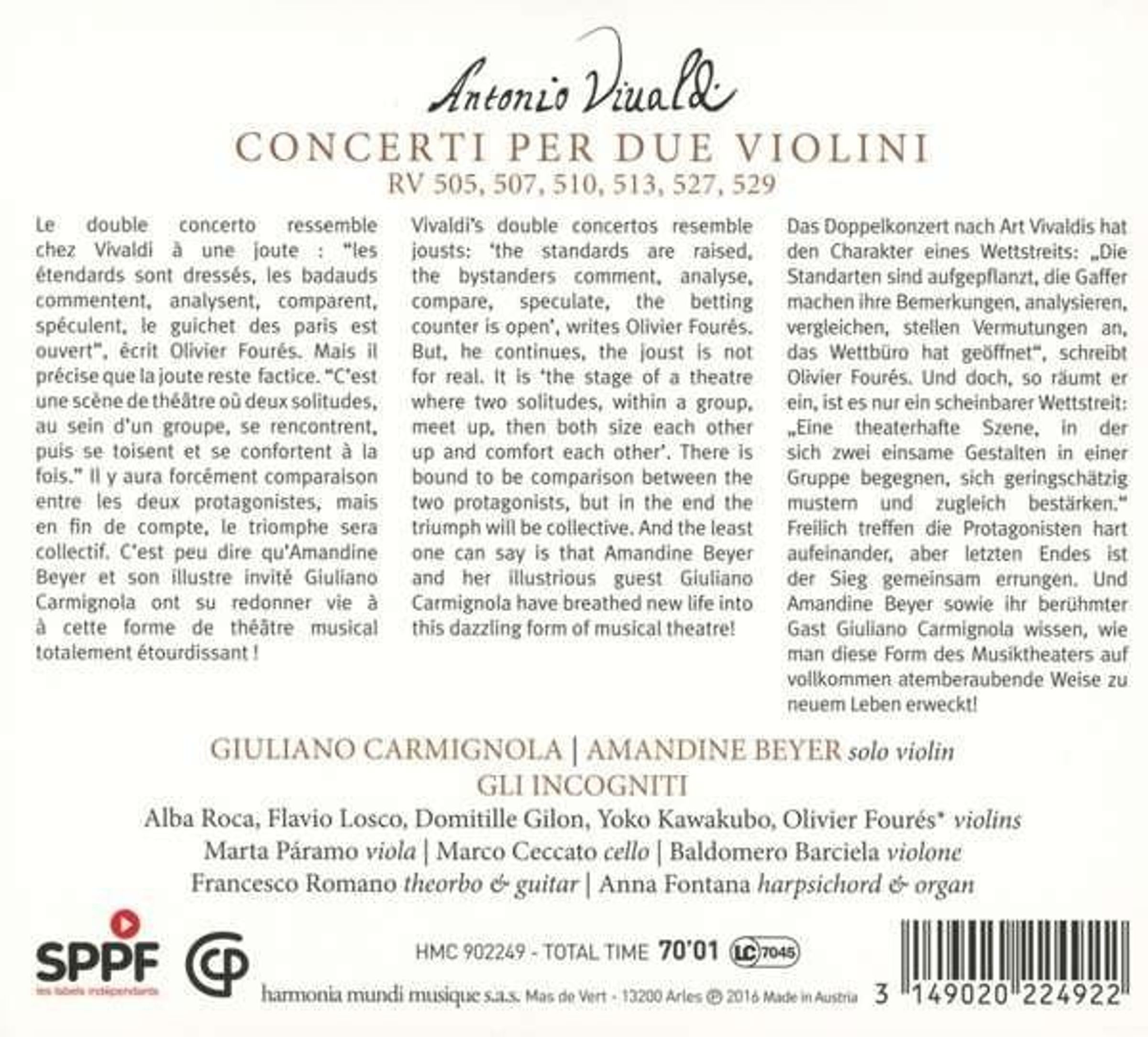 »Die beiden werfen sich gegenseitig die Bälle zu und scheuchen einander in immer höhere Sphären der Virtuosität, wozu Vivaldis Doppelkonzerte reichlich Anlass bieten.« (Fono Forum, Februar 2017)Disk 1 von 1 (CD)