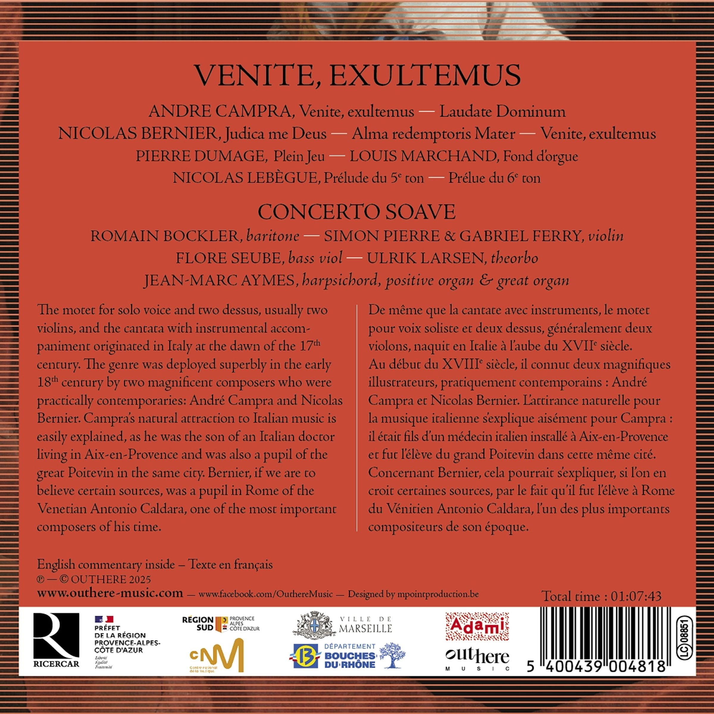 Die Motette fur Solostimme und zwei Begleitstimmen – meist zwei Violinen – sowie die Kantate mit Instrumentalbegleitung entstanden Anfang des 17. Jahrhunderts in Italien. Durch Marc-Antoine Charpentier und reisende italienische Musiker gelangten diese Gattungen nach Frankreich und wurden rasch zu Vorzeigestücken italienischen Geschmacks und Stils. Im frühen 18. Jahrhundert wurden sie von zwei herausragenden Komponisten, die nahezu Zeitgenossen waren, meisterhaft weiterentwickelt: Andre Campra und Nicolas Bernier. Campras Vorliebe für die italienische Musik erklärt sich leicht – er war der Sohn eines italienischen Arztes in Aix-en-Provence und Schüler des großen Musikers und Komponisten Guillaume Poitevin in derselben Stadt. Nicolas Bernier wiederum, so berichten einige Quellen, war Schüler des Venezianers Antonio Caldara in Rom, einem der bedeutendsten Komponisten seiner Zeit.
