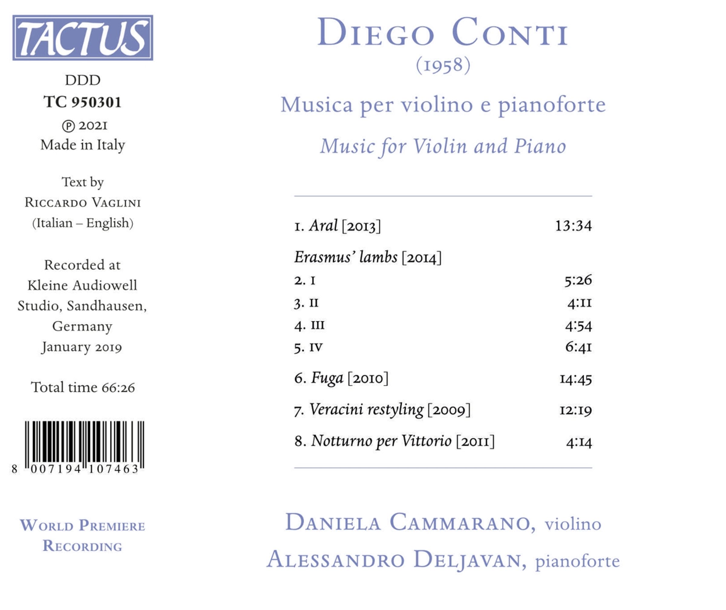 Zwei talentierte Musiker – Daniela Cammarano und Alessandro Deljavan – sind die Protagonisten von Diego Contis Musik für Violine und Klavier, die nur wenige Monate nach der Veröffentlichung der Werke für Cello und Streicher als Weltpremiere auf einer CD erschien.