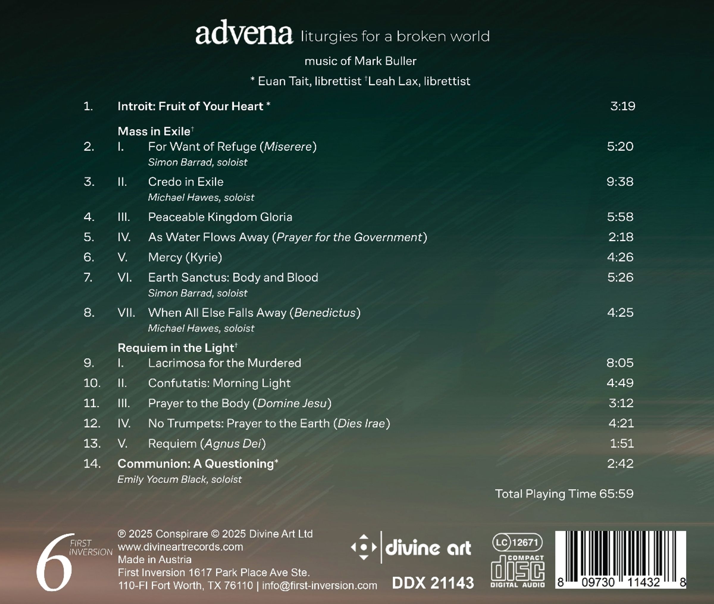 „advena: liturgies for a broken world“ präsentiert Weltpremieren der Chormusik des Komponisten Mark Buller, aufgeführt vom Grammy-preisgekrönten Chor Conspirare unter der Leitung des künstlerischen Leiters Craig Hella Johnson. Entstanden aus einer persönlichen Auseinandersetzung mit seinem ererbten Glauben und seiner Kultur, sind „Mass in Exile“ und „Requiem for the Light“ Liturgien, die ausgehend aus unserer Gegenwart neu interpretiert wurden. Die von Mark Buller komponierten und von Leah Lax librettierten Werke interpretieren alte Formen aus der Perspektive unserer Gegenwart neu. Bullers lebendige Musiksprache verbindet sich mit mystischen Chortexturen zu einer emotionalen Intensität, die intim und eindringlich wirkt. Diese Werke werden zwischen zwei Begleitwerken präsentiert – „Introit: Fruit of Your Heart“ und „Communion: A Questioning“ – mit Texten des britischen Dichters und Librettisten Euan Tait, die mit ihren gesangartigen Vertonungen die Kernthemen des Projekts erweitern. Der Chor Conspirare zeigt sich in dieser Musik von seiner besten Seite, und die Sänger Simon Barrad, Emily Yocum Black und Michael Hawes sind in Solorollen zu hören. Conspirare wird begleitet von den Musikern Patrice Calixte, Mariama Alcântara, Bruce Williams, Douglas Harvey, Jessica Valls, Marc Garvin und Thomas Burritt.
