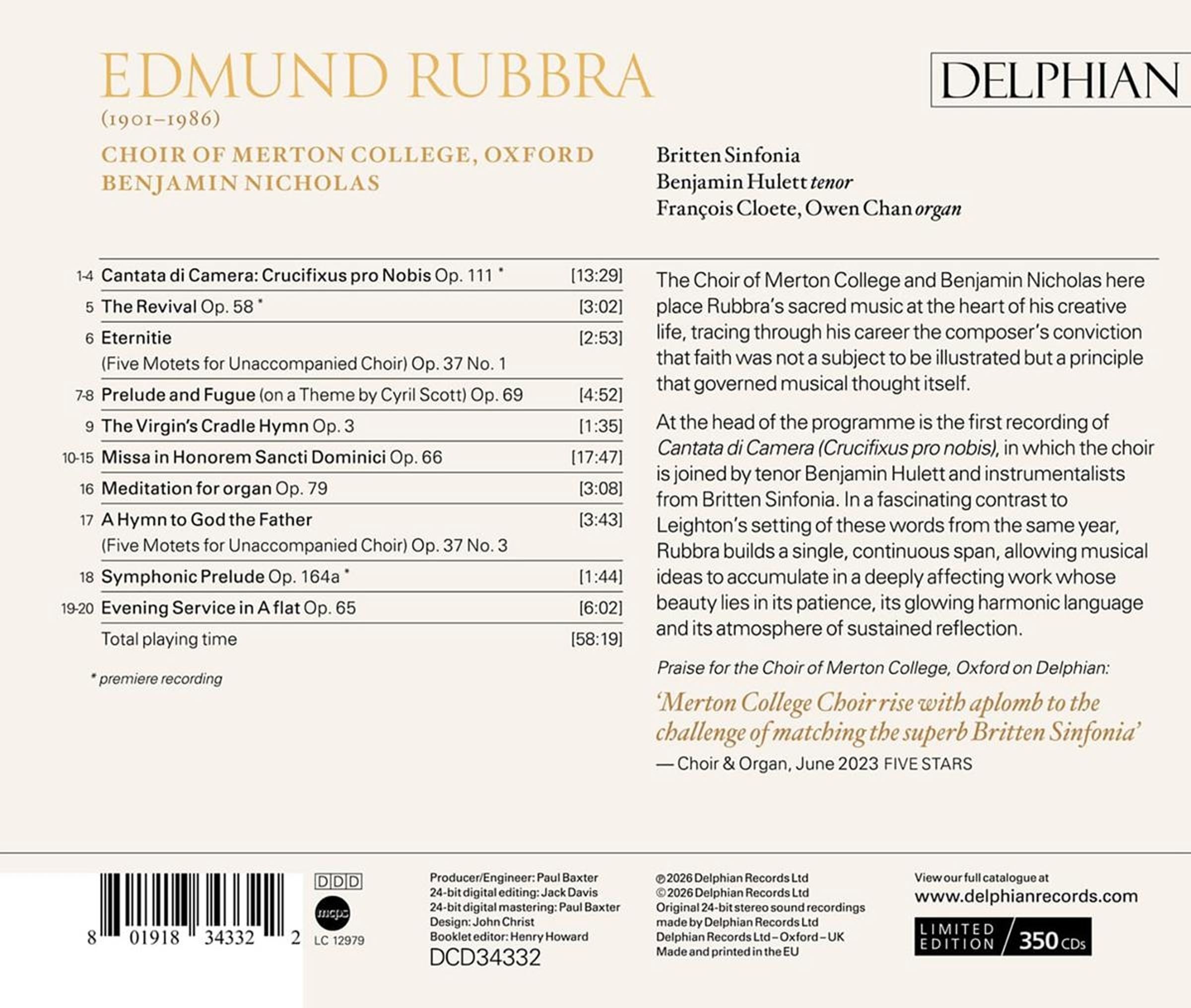 Der Chor des Merton College und Benjamin Nicholas stellen hier Rubbras geistliche Musik in den Mittelpunkt seines Schaffens und verfolgen im Verlauf seiner Karriere die Überzeugung des Komponisten, dass der Glaube kein Thema sei, das es zu veranschaulichen gelte, sondern ein Prinzip, das das musikalische Denken selbst bestimme. Den Auftakt des Programms bildet die erste Aufnahme der Cantata di Camera (Crucifixus pro nobis), in der der Chor von dem Tenor Benjamin Hulett und Instrumentalisten der Britten Sinfonia begleitet wird.