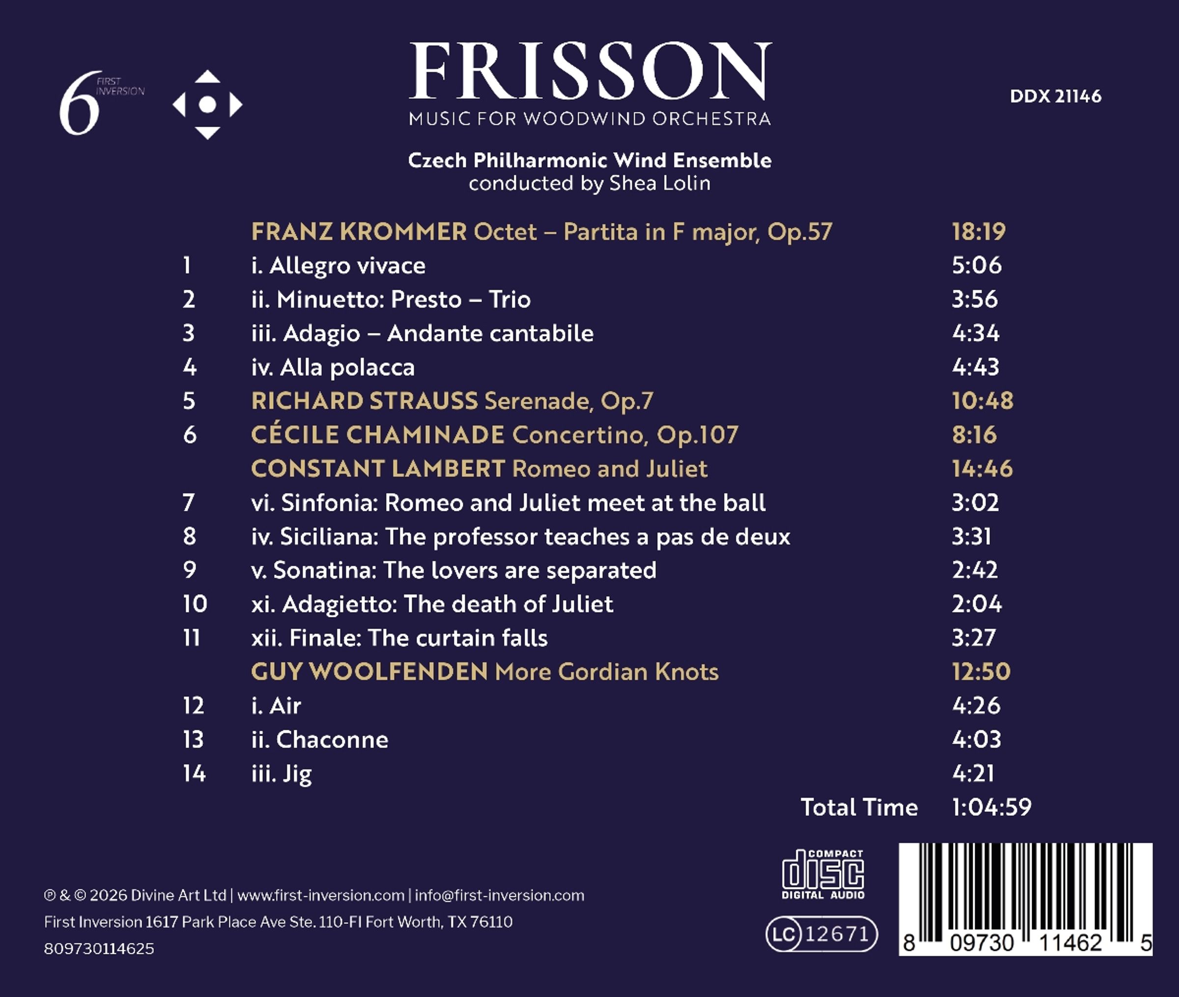 Dirigent Shea Lolin prasentiert "Frisson", ein spannendes neues Album mit Musik fur Holzblaserorchester und seine dritte Aufnahme mit den Solisten der Tschechischen Philharmonie (Gramophone's Orchestra of the Year 2024). "Frisson" folgt auf die Veroffentlichung des bahnbrechenden Albums "Twisted Skyscape", dem ersten Album, das sich ausschliesslich der neuen Musik fur Holzblaserorchester widmet, und "Chromosphere", das sich auf zeitgenossisches