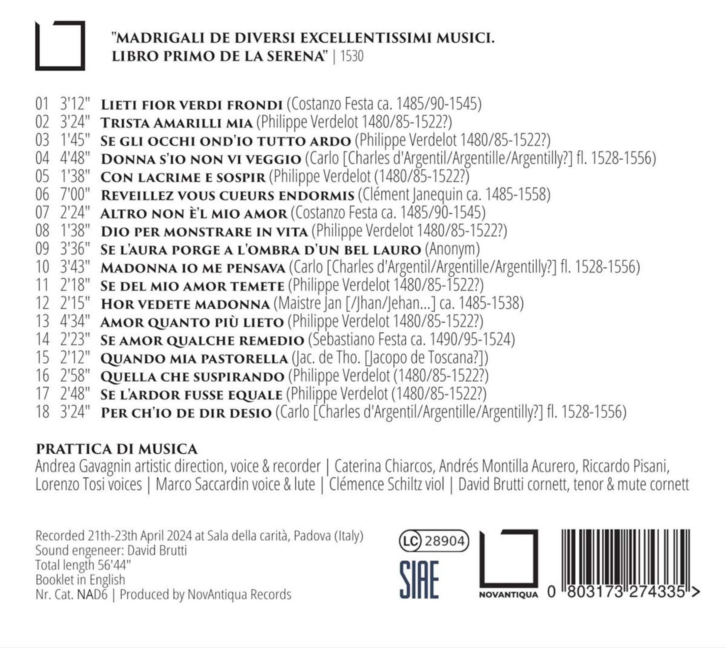 +Philippe Verdelot: Trista Amarilli Mia; Se Gli Occhi Ond'Io Tutto Ardo; Con Lacrime E Sospir; Dio Per Monstrare In Vita; Se Del Mio Amor Temete; Amor Quanto Piu Lieto; Quella Che Suspirando; Se Lardor Fusse Equale