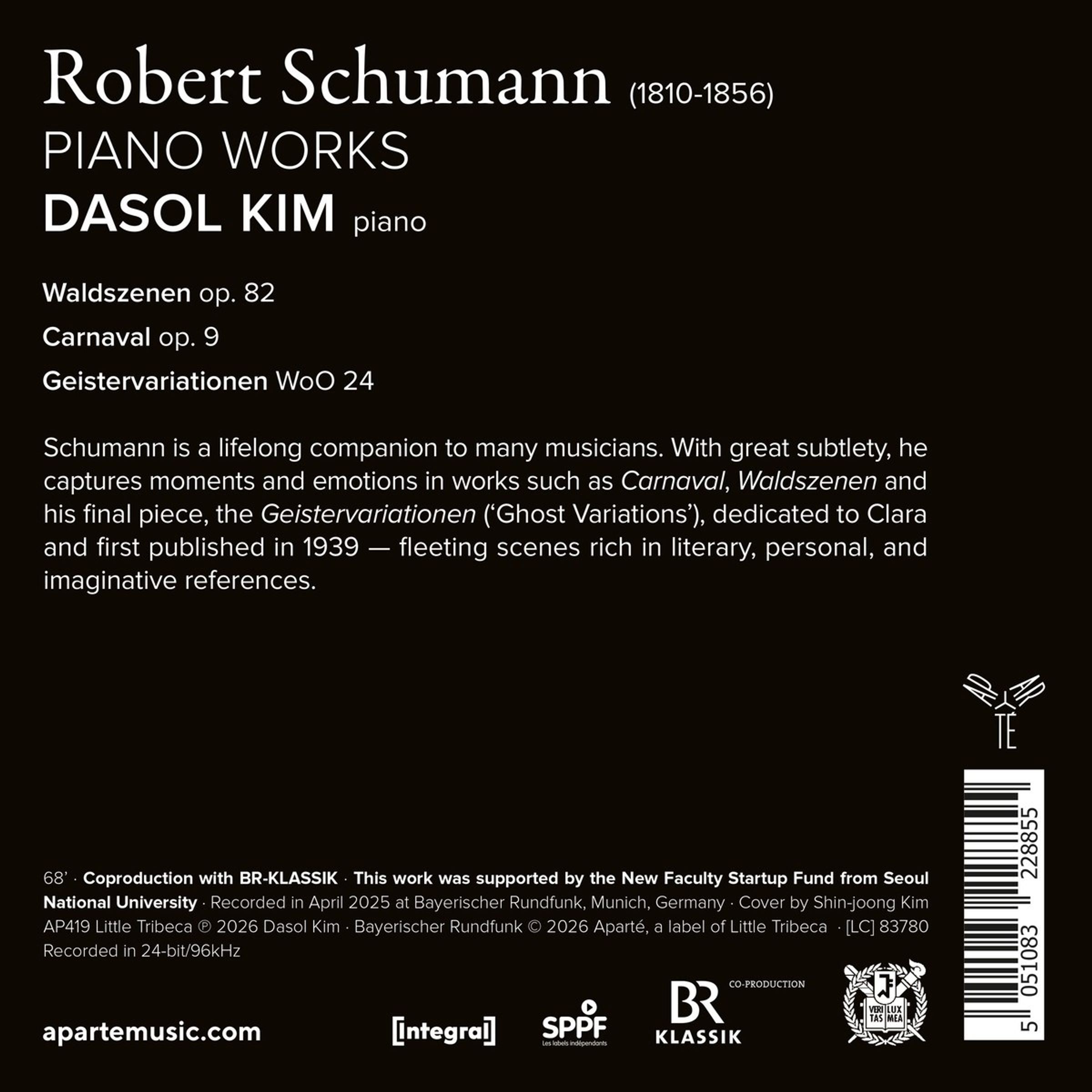 Schumann ist einer der großen Wegbegleiter vieler Musiker, und das gilt auch für Dasol Kim. Dem Komponisten gelingt es, mit viel Feingefühl die flüchtigen und prägenden Momente und Emotionen des Lebens einzufangen. Sein Carnaval, die Waldszenen oder sein letztes Werk, die Geistervariationen, die Clara gewidmet sind und erstmals 1939 veröffentlicht wurden, enthalten zahlreiche Bezüge zu Mythen, zur Literatur, zu Schumanns Leben und seinen Gedanken – die Dasol Kim hier erkundet.