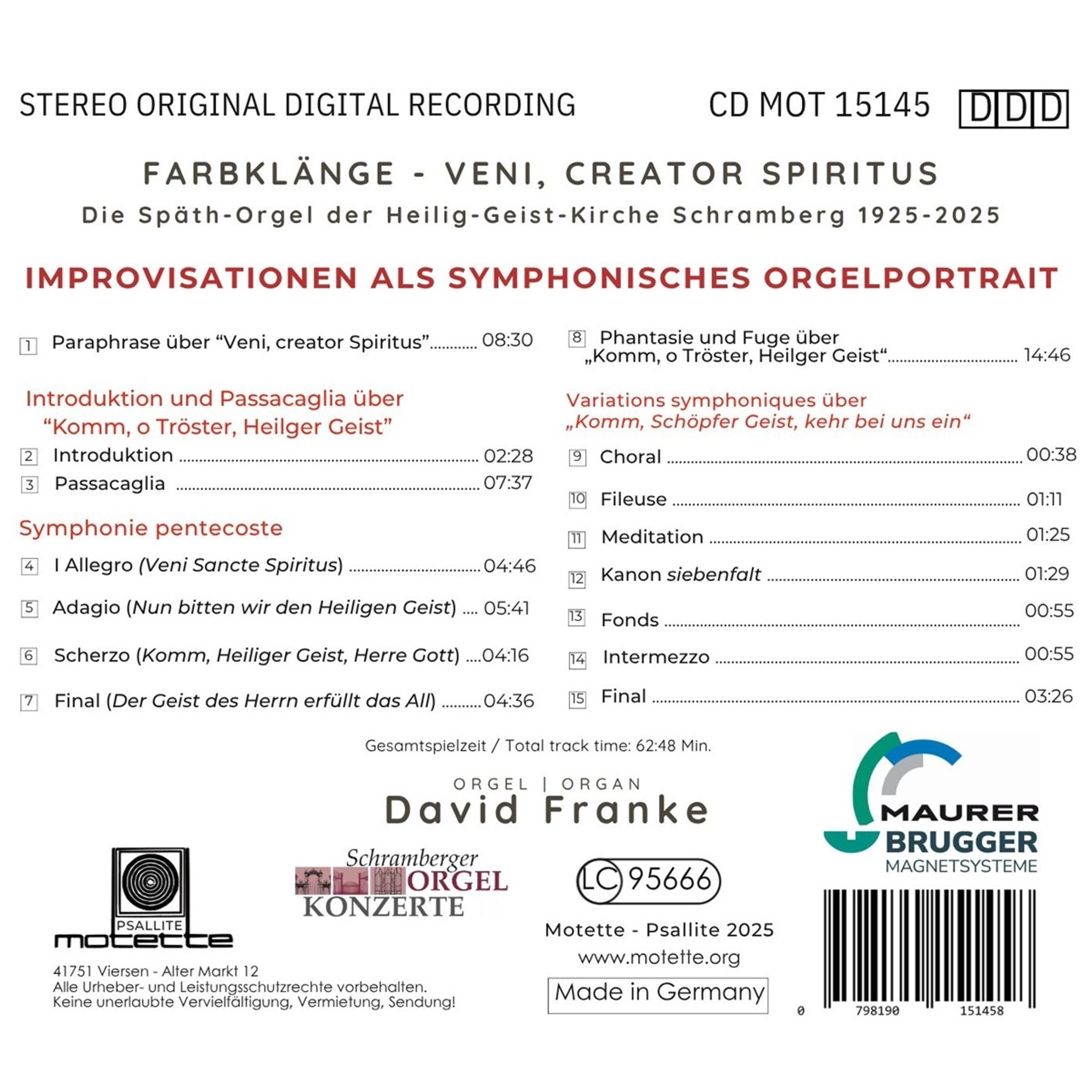 Zum 100-jährigen Jubiläum der Späth-Orgel in der Heilig-Geist-Kirche Schramberg ist ein außergewöhnliches Klangporträt unter dem Motto „Veni, creator Spiritus – Komm, Gott, Schöpfer, Heiliger Geist“ entstanden. Der Organist David Franke vereint sinfonische Improvisationen deutscher und französischer Couleur – inspiriert von der Klangwelt der Orgel und der spirituellen Kraft der Pfingstchoräle. In freier musikalischer Gestaltung entstehen Werke voller Farbenreichtum und Ausdruck: Gregorianische Paraphrasen, Passacaglien, Fantasien, Fugen und Variationen über „Komm, Schöpfer Geist, kehr bei uns ein“ entfalten sich zu einem lebendigen Dialog zwischen Tradition und Gegenwart.
