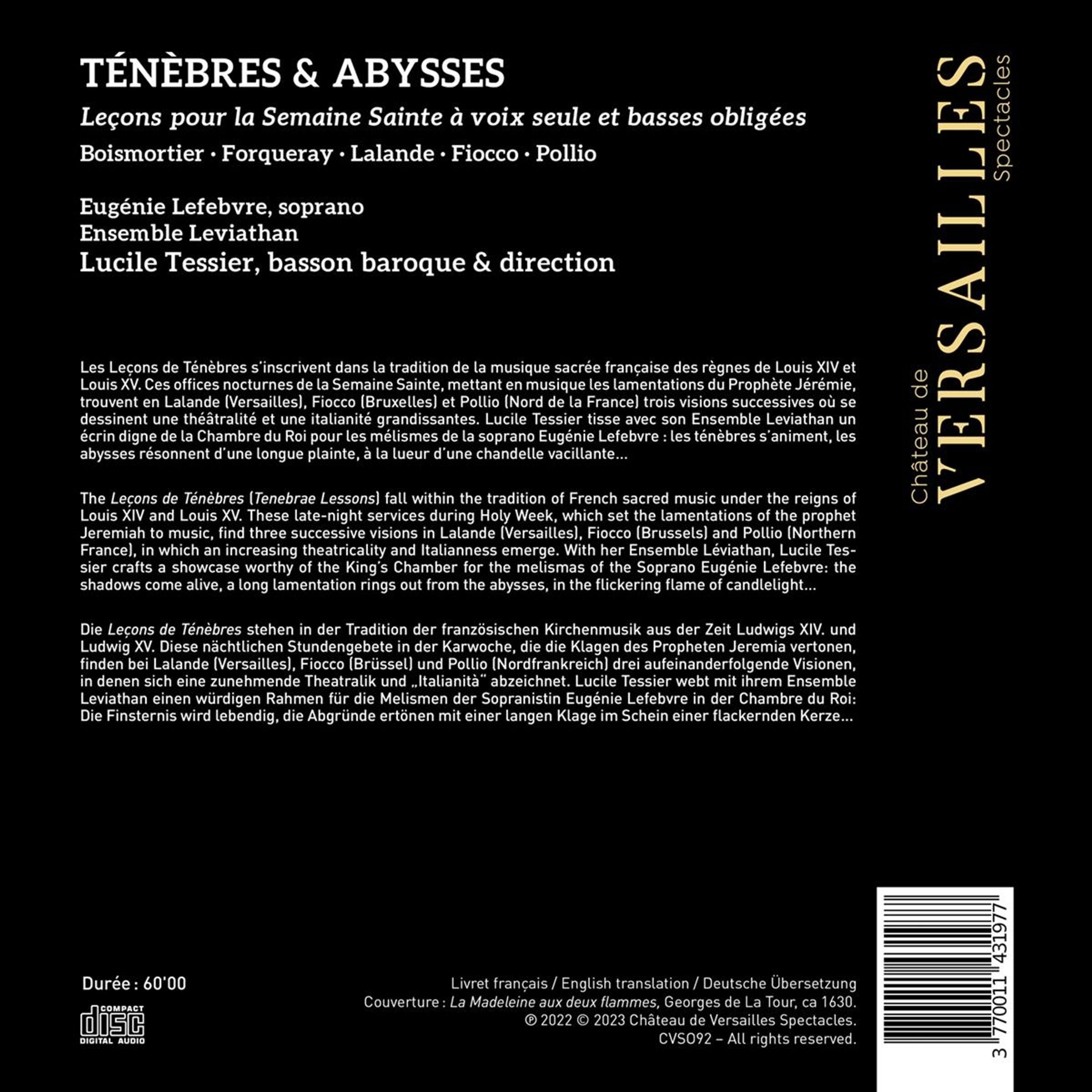Zur Zeit Ludwigs XIV. und Ludwigs XV. gehörten Leçons de Ténèbres zu den musikalischen Höhepunkten während der nächtlichen Gottesdienste in der Karwoche, in der nach jeder Leçon der Kirchenraum weiter verdunkelt wurde. In den hier vorgestellten Vertonungen von Delalande, Fiocco und Pollio lässt sich eine zunehmende Theatralik und der Einfluss des italienischen Stils erkennen, der damals auch vor der Kirche nicht Halt machte. Mit ihrem Ensemble Léviathan bietet Lucile Tessier den Melismen der Sopranistin Eugénie Lefebvre eine Bühne, die der königlichen Kapelle würdig ist.