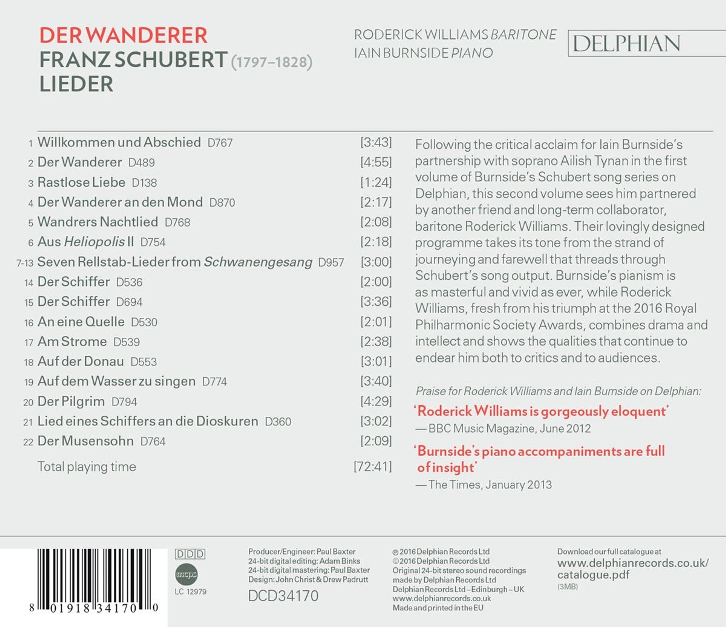 Willkommen und Abscheid D. 767; Der Wanderer D. 489; Rastlose Liebe D. 138; Der Wanderer an den Mond D. 870; Wandrers Nachtlied D. 768; Aus Heliopolis II D. 754; 7 Rellstab-Lieder aus "Schwanengesang" D. 957; Der Schiffer D. 536 & D. 694; An eine Quelle D. 530; Am Strome D. 539; Auf der Donau D. 553; Auf dem Wasser zu singen D. 774; Der PilgrimD. 794; Lied eines Schiffers an die Dioskuren D. 360; Der Musensohn D. 764