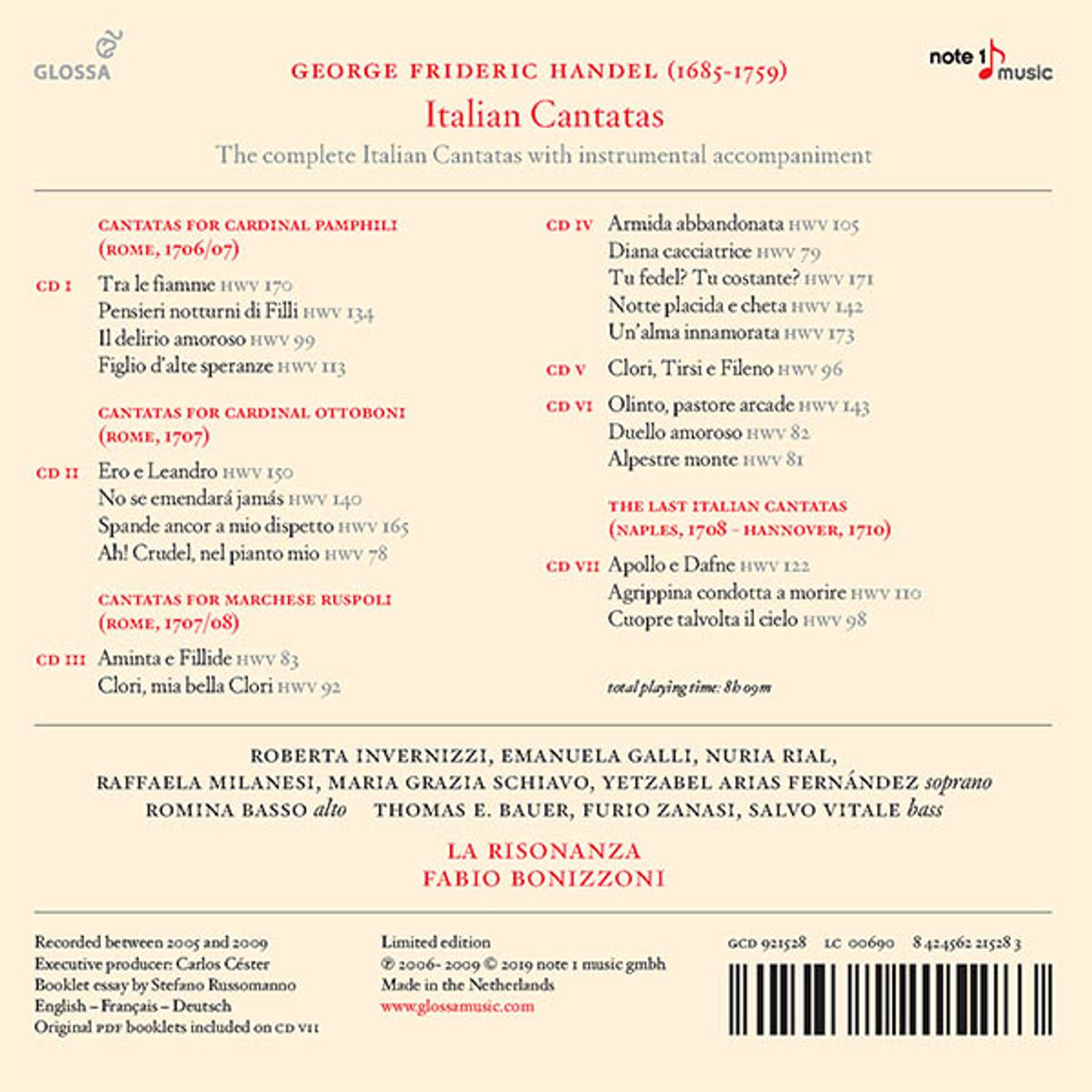 Mit der Gesamtaufnahme bei GLOSSA präsentierte Fabio Bonizzoni mit seinem Ensemble La Risonanza eine der wichtigsten CD-Reihen der letzten Jahrzehnte. Die Serie glänzte dabei immer mit den besten Solisten der Barockszene – zu hören sind u. a. Roberta Invernizzi, Nuria Rial oder Raffaela Milanesi. Diese Gesamteinspielung ist nun als Box in einer limitierten Edition erhältlich. Sie enthält einen neuen Booklettext und alle gesungenen Texte. Zusätzlich befinden sich auf der siebten CD die PDF-Versionen der Originalbooklets.