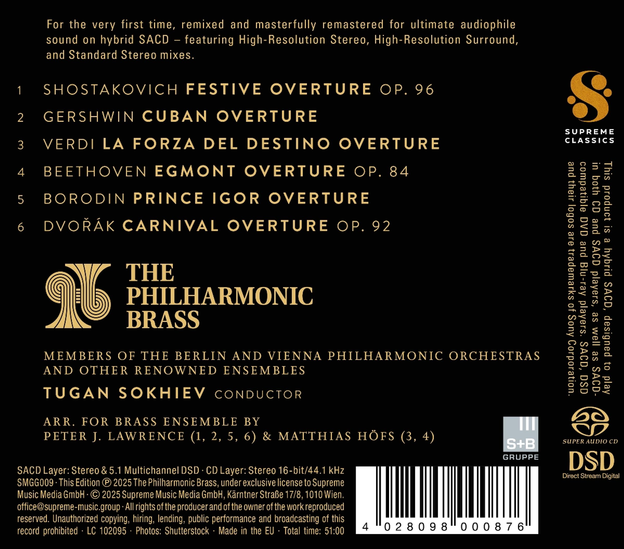 Nach einem vielbeachteten Debüt im Wiener Musikverein im Jahr 2023 veröffentlichten The Philharmonic Brass ihr erstes Album „Overture!“ unter der Leitung von Tugan Sokhiev. Gemeinsam mit Riccardo Muti erreichte die Gruppe einen neuen Höhepunkt in ihrer jungen Karriere und brachte im Frühjahr 2025 das gefeierte Album „Italiana!“ heraus. Um den höchsten audiophilen Standards gerecht zu werden, kommt es nun durch Supreme Classics zu einer Wiederveröffentlichung des ersten Albums „Overture!“ als Hybride SACD und digital in Dolby Atmos. „Overture!“ enthält virtuose Arrangements einiger der bekanntesten Ouvertüren, darunter Giuseppe Verdis „La Forza del Destino“ und George Gershwins „Cuban Overture“.