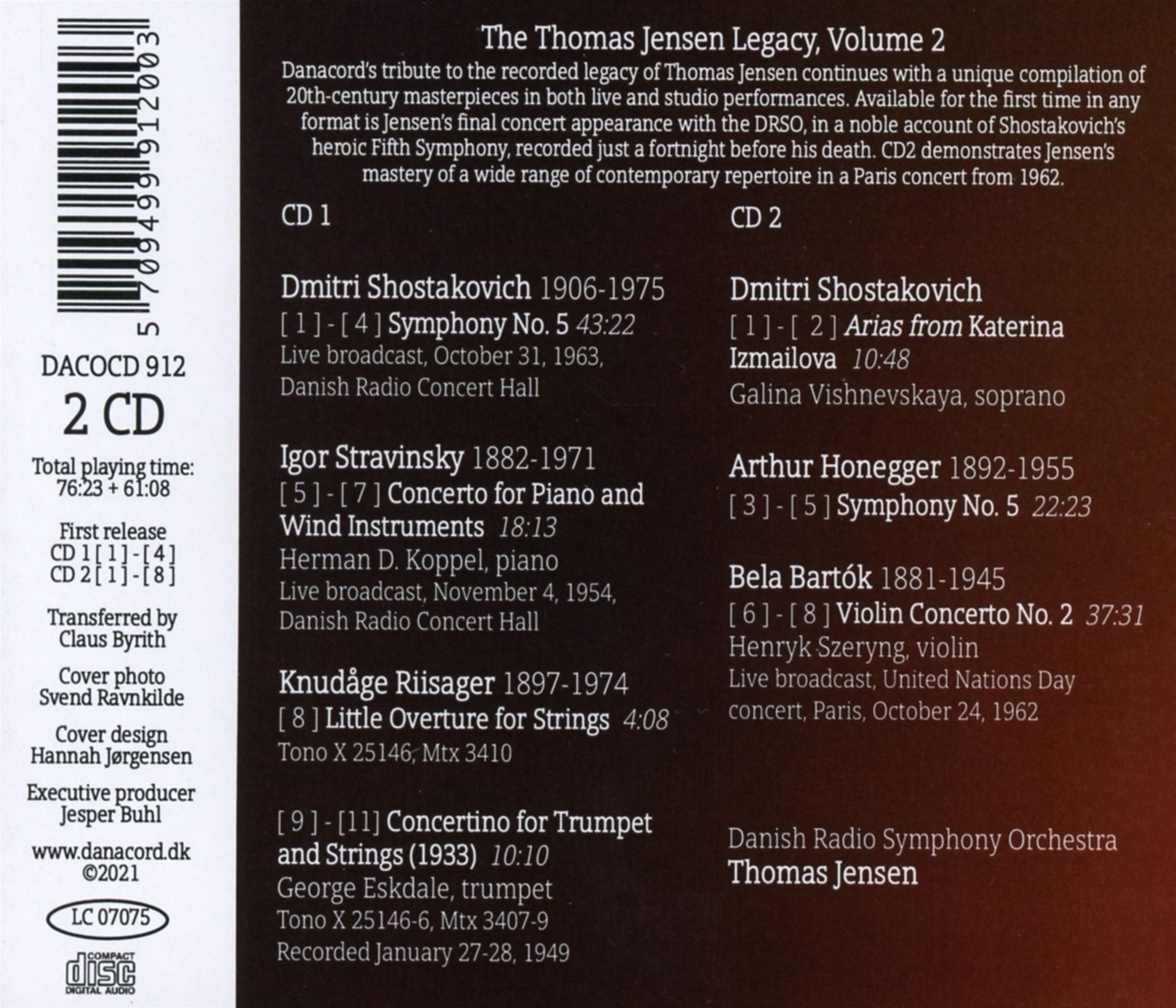 Die Jensen-Dokumentation wird fortgesetzt mit einer einzigartigen Kombination von Meisterwerken des 20. Jahrhunderts in Live- und Studioaufnahmen. Erstmals ist hier Jensens letzter Auftritt mit dem DRSO zu hören zusammen mit einer Produktion von Schostakowitschs heroischer 5. Symphonie, die 14 Tage vor Jensens Tod entstand. Und dazu noch ein Konzert aus Paris, 1962 aufgenommen, das sehr gut Jensens meisterliche Beherrschung weitgefächerter zeitgenössischer Komposition zeigt.
