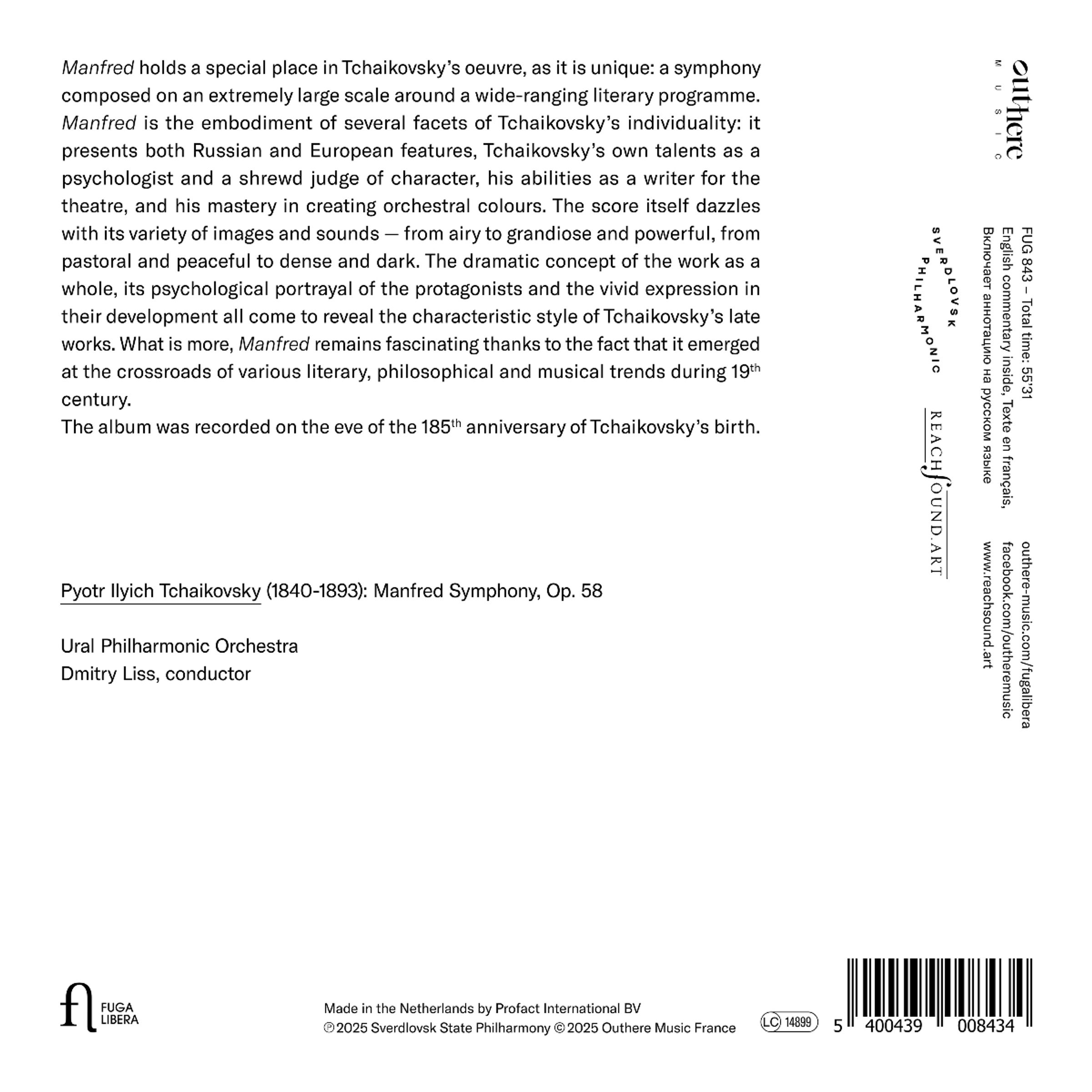 »Manfred«, eine Symphonie, die in einem extrem großen Rahmen um ein umfangreiches literarisches Programm herum komponiert wurde, nimmt in Tschaikowskys Schaffen eine Sonderstellung ein. Dieses Werk verkörpert mehrere Facetten von Tschaikowskys Individualität: Es zeigt sowohl russische als auch europäische Züge, Tschaikowskys eigene Talente als Psychologe und scharfsinniger Menschenkenner, seine Fähigkeiten als Theaterautor und seine Meisterschaft in der Gestaltung von Orchesterfarben. Die Partitur selbst verblüfft durch ihre Vielfalt an Bildern und Klängen – von luftig bis pompös und kraftvoll, von idyllisch und friedlich bis dicht und dunkel. Die dramatische Konzeption des Werkes als Ganzes, die psychologische Darstellung der Protagonisten und der lebendige Ausdruck in ihrer Entwicklung lassen den charakteristischen Stil von Tschaikowskys Spätwerk erkennen. Darüber hinaus fasziniert »Manfred« durch die Tatsache, dass es am Kreuzungspunkt verschiedener literarischer, philosophischer und musikalischer Strömungen des 19. Jahrhunderts entstand. Das Album wurde kurz vor Tschaikowskys 185. Geburtstag aufgenommen.