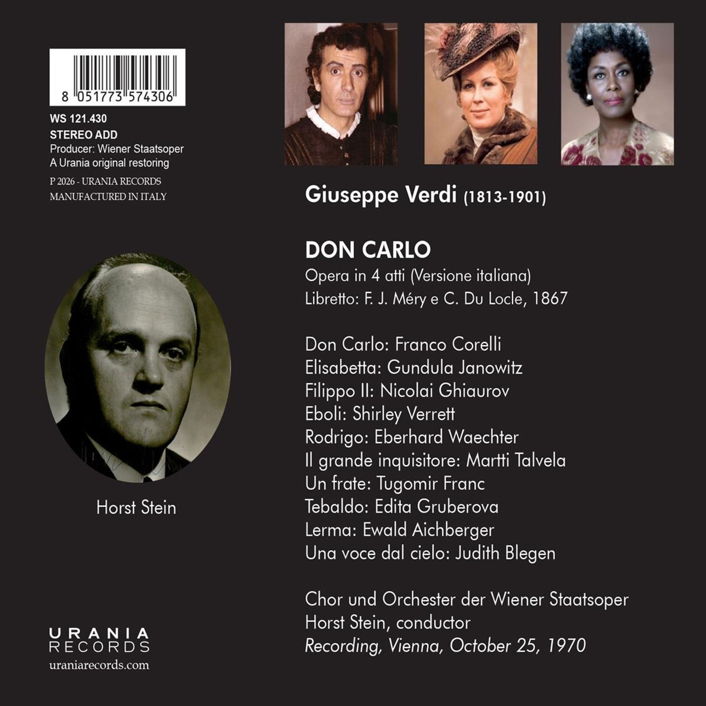 Das vorliegende Album ist die Wiederveröffentlichung eines früheren ORFEO-Bestsellers und enthält die Premiere der Neuproduktion von Oktober 1970 in Wien. Die Premiere war von einem großen Skandal umgeben, verursacht von Karajans Fans, die nicht bereit waren sich damit abzufinden, dass ihr Idol die neue Produktion nicht dirigieren würde. Es half auch nicht, dass es Karajan selbst war, der die Neuinszenierung dem deutschen Dirigenten Horst Stein anvertraute. Und obwohl Stein schon seit mehreren Jahren an der Wiener Staatsoper Repertoirevorstellungen dirigierte und bis dahin der Liebling des heimischen Publikums gewesen war, wurde er diesmal beim Vorhangruf mit einer Flut von Buhrufen begrüßt, die in keinem Zusammenhang mit seiner künstlerischen Leistung standen. Ungetrübt war der Jubel dagegen schon am Premierenabend für die Sänger. Tatsächlich hatte die Wiener Staatsoper für diesen „Don Carlo“ eine Besetzung aufgeboten, die exquisit zu nennen ist, einschließlich der kleineren Partien.