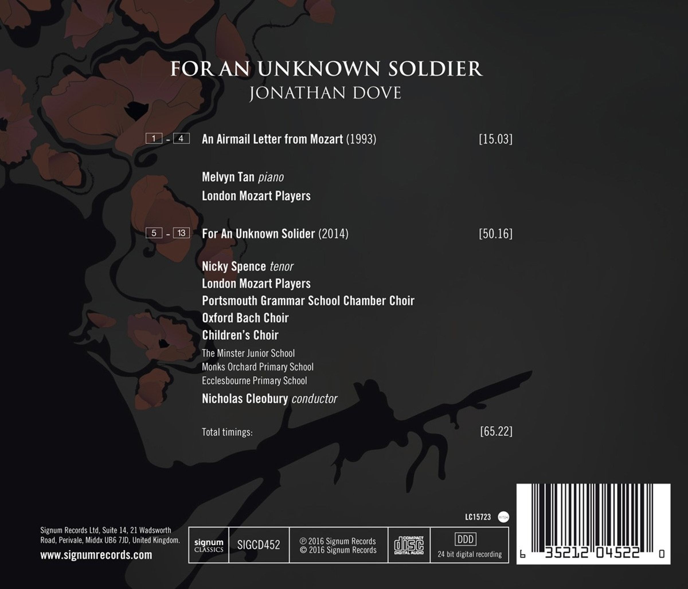Jonathan Doves Durchbruch kam 1998, als er für das Glyndebourne Festival seine Oper »Flight« komponierte. Seither einer der gefragtesten Komponisten Großbritanniens komponierte er unter anderem für die Berliner Philharmoniker, das Festival Aix-en-Provence oder das London Symphony Orchestra. Seine Kantate »For An Unknown Soldier« und sein »An Airmail Letter to Mozart« sind nun bei SIGNUM nachzuhören.