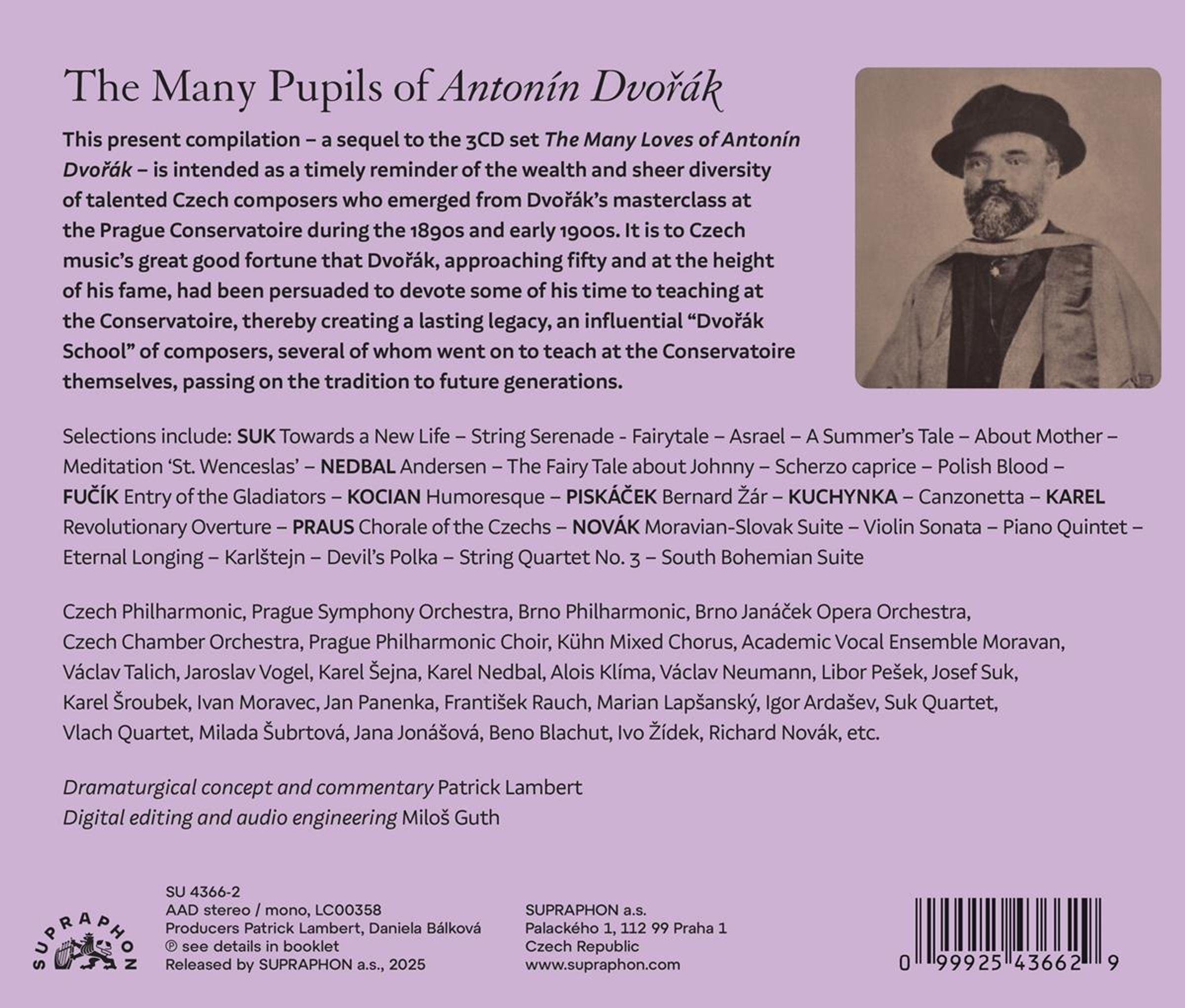 - Jan Panenka, Josef Suk, Jarmila Hladikova, Marie Mrazova, Ivan Moravec, Karel Sroubek, Frantisek Maxian, Milada Subrtova, Oldrich Kovar, Milos Bily, Pavla Brinkova, Jana Jonasova, Vratislav Kadlec, Richard Novak, Anna Barova, Leo Marian Vodicka, Jirina Kolmanova, Pavel Stepan, Beno Blachut, Alfred Holecek, Marian Lapsansky, Ivan Kusnjer, Pavel Kühn, Frantisek Rauch, Prague Philharmonic Choir, Kühn Mixed Chorus, Academic Vocal Ensemble Moravan, Czech Philharmonic Orchestra, Prague Symphony Orchestra, Brno Philharmonic Orchestra, Brno Janacek Opera Orchestra, Czech Chamber Orchestra, Suk Quartet, Dvorak Chamber Orchestra, Smetana Theatre Orchestra, Vlach Quartet, Vaclav Talich, Jaroslav Vogel, Karel Sejna, Josef Vlach, Petr Skvor, Libor Pesek, Miroslav Homolka, Alois Klima, Vaclav Neumann, Vaclav Smetacek u. a.