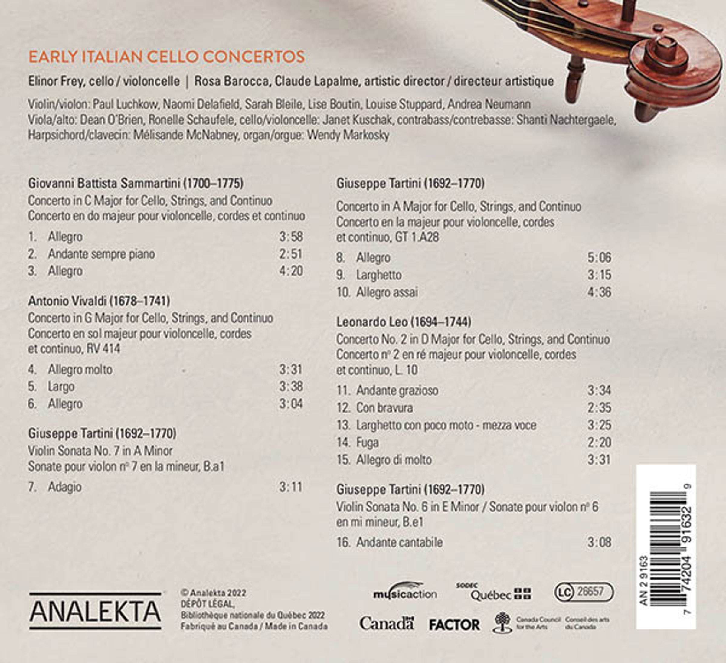 Durch die Zusammenstellung von vier italienischen Cellokonzerten – von Vivaldi, Leo, Sammartini und Tartini – erkundet Elinor Frey die einzigartige und fesselnde Klangwelt der Violoncello-Familie in einer Zeit, in der die Komponisten »galante« Melodien schrieben und wir uns an den reichen Harmonien und ausdrucksstarken Kontrapunkten erfreuen, die mit der Barockmusik verbunden sind. Diese Aufnahme, die in Zusammenarbeit mit dem Ensemble Rosa Barocca entstanden ist, trägt zur aktuellen Forschung von Interpreten und Musikwissenschaftlern über das Barockcello bei und ist Konzerten gewidmet, die das Interesse an dem kleineren Violoncello des Spätbarocks geweckt haben.