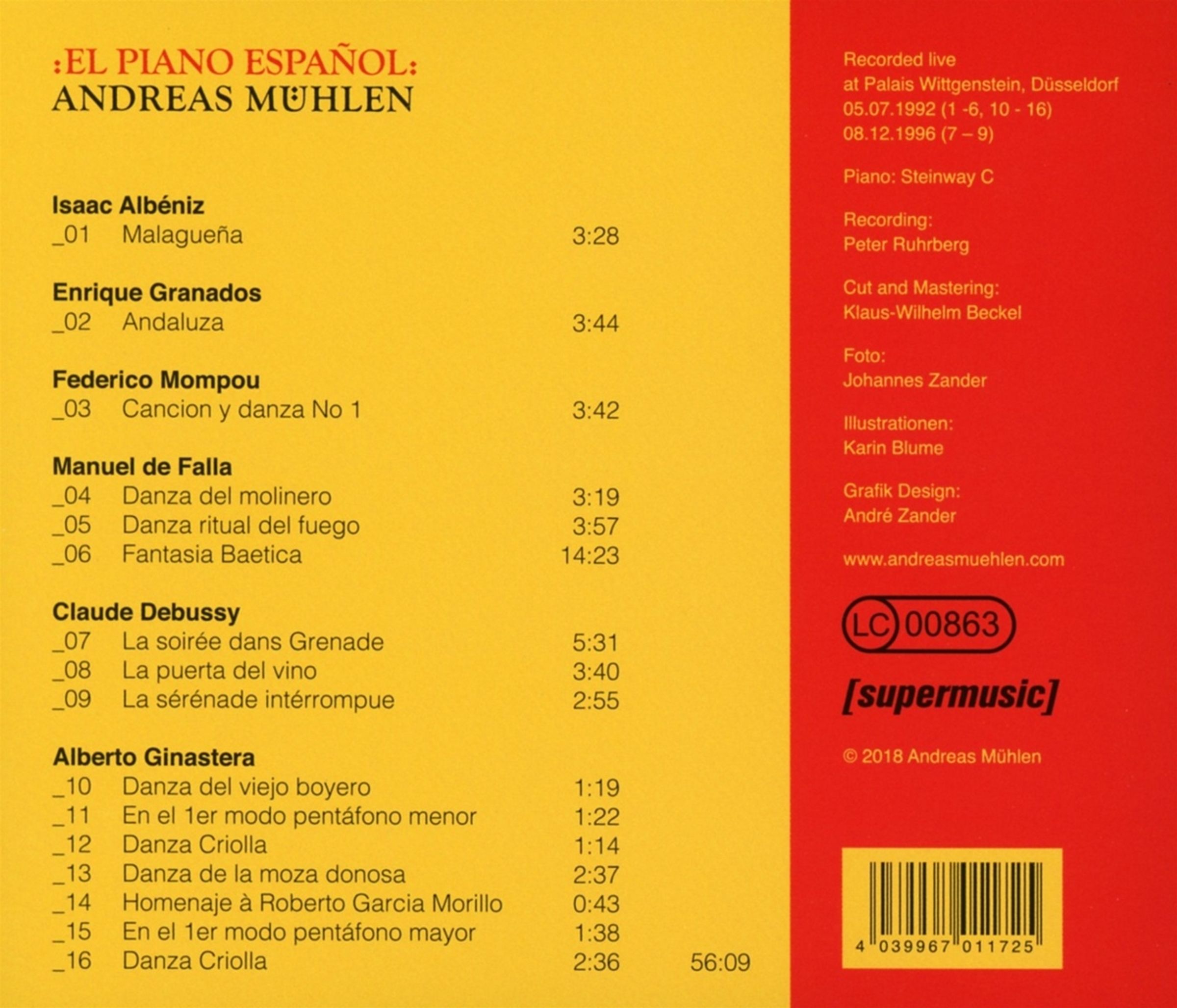 »Der Pianist Andreas Mühlen feierte ›el piano español‹, spanische Klaviermusik also, um diese zugleich auf große europäische Musiktraditionen hin auszuweiten. Diesem hohen Anspruch wurde Andreas Mühlen auf bewunderungswürdige Weise gerecht. Er hat nichts von Virtuosengehabe an sich, entfesselt aber etwa an Stücken von Enrique Granados oder Manuel de Falla Klangabenteuer, dass es den Atem verschlägt und die Zuhörer stellenweise ob der Entladungen wie betäubt waren. Das besondere Merkmal für diesen Künstler ist eine wie gestochene Präzision. Nicht ein Ton geht im Gewölk der Klänge, im fetzenden Temperament der Tanzsätze unter. Zwischendurch aber schoss Andreas Mühlen mit Claude Debussy, dem er auch mit zwei der durch wie rasenden Beifall ausgelösten Zugaben huldigte, regelrechte Raketen ab, derart signalhaft war das Spanische in das Europäische eingebunden, das bravouröse Können kultureller Weitsicht unterordnend. Man darf wahrhaftig von einem großen Abend im Museum Baden sprechen.« (Solinger Morgenpost)Disk 1 von 1 (CD)