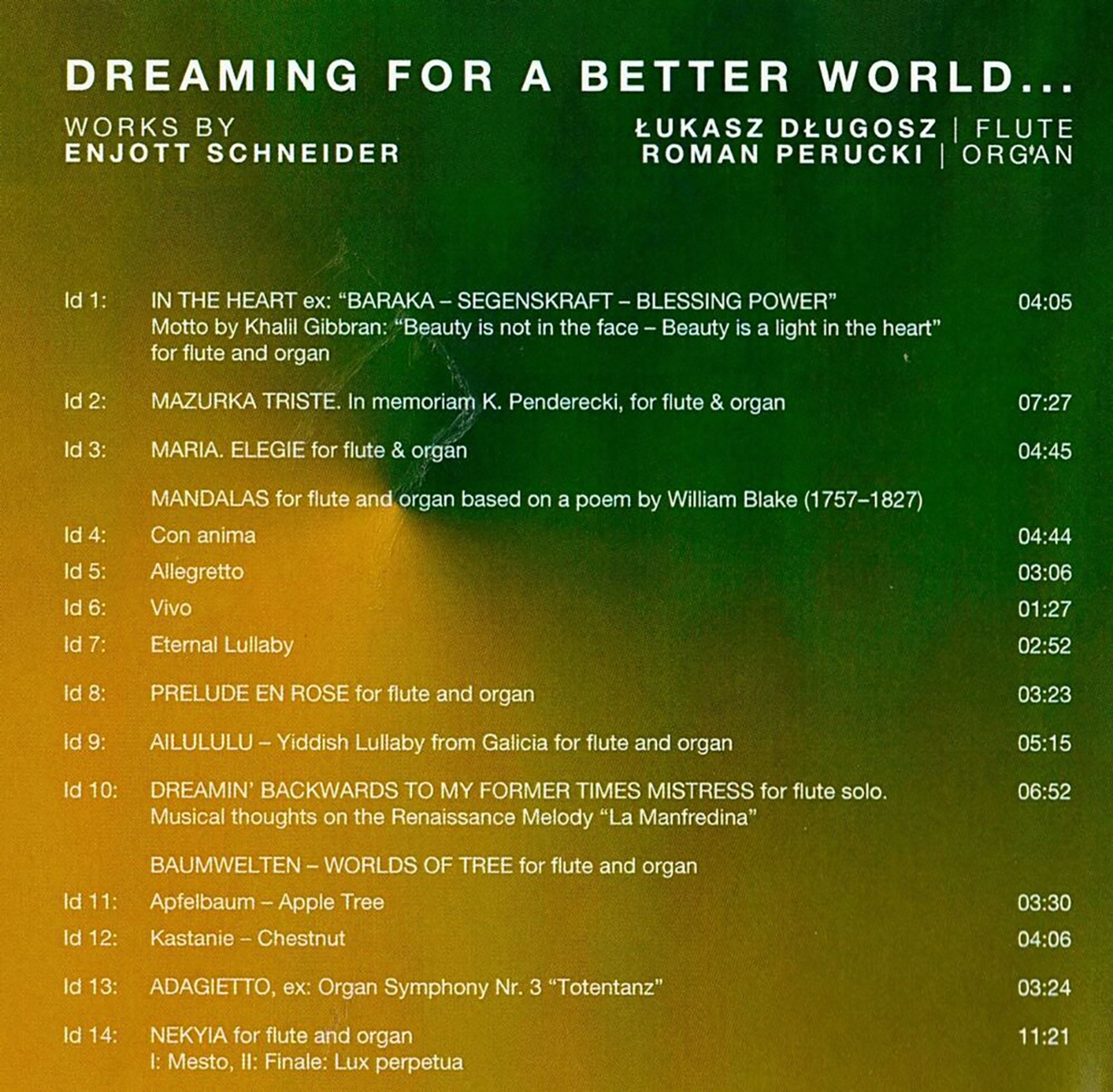 Auf der CD »DREAMING OF A BETTER WORLD« präsentieren die beiden polnische Künstler Lukasz Dlugosz (Flöte) und Roman Perucki (Orgel) Werke von Enjott Schneider. Aufgenommen im Juli 2025 in Gdansk / Polen in der Baltischen Philharmonie »Frederic Chopin« an der Kuhn-Orgel.