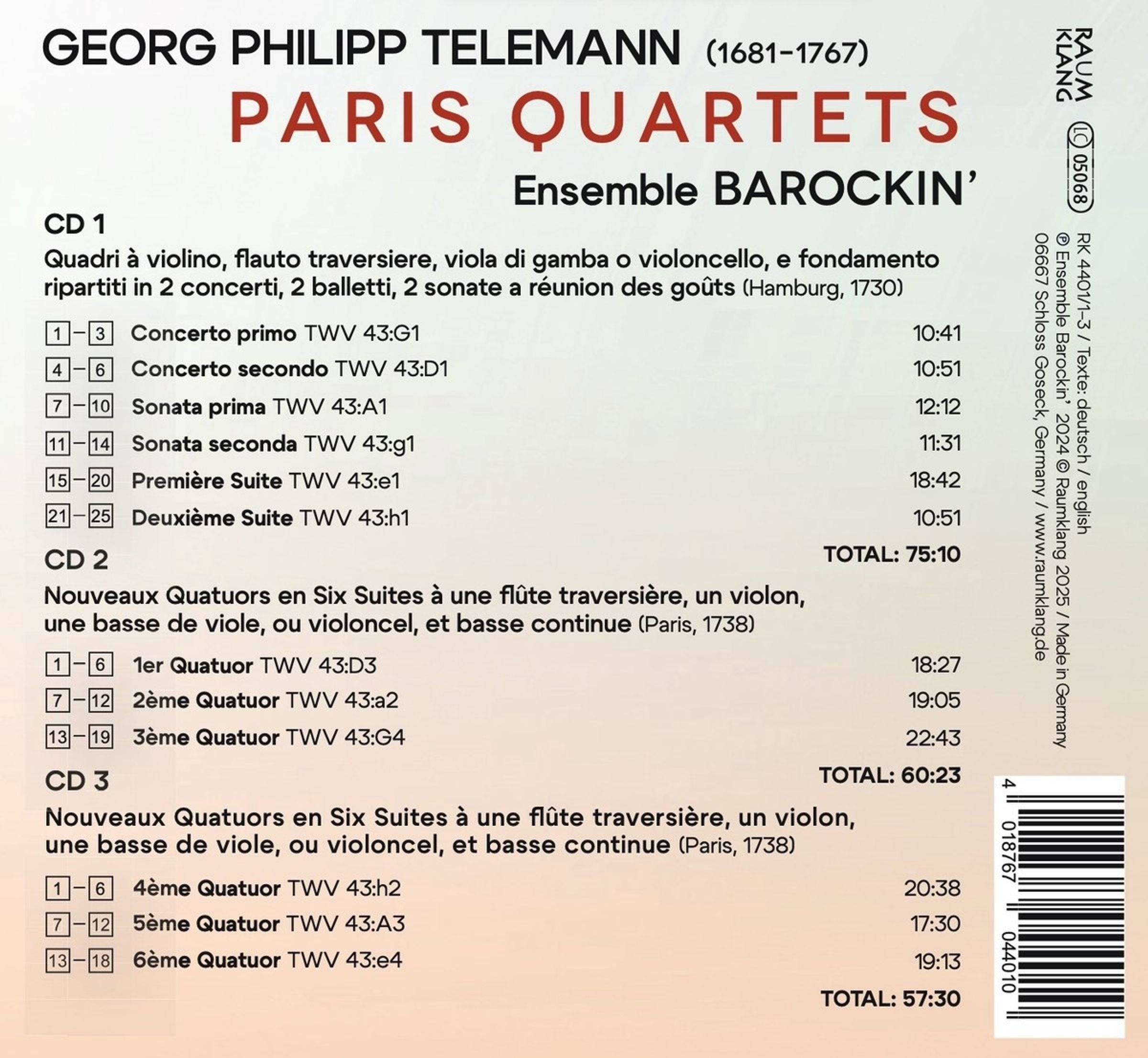 Mit seiner neuen Einspielung der »Paris Quartetts«, lässt sich das seit 15 Jahren bestehende Ensemble Barockin’ von Telemanns unerschöpflichem Esprit inspirieren. Die neue Gesamtaufnahme auf 3 CDs klingt erstaunlich modern: Eine kraftvolle Interpretation, die vor Vitalität strotzt – egal, wo man die Klinge ansetzt, es spritzt frischer, musikalischer Saft heraus. Paris, Winter 1737 – der 57-jährige Hamburger Kantor Georg Philipp Telemann (1681–1767) erlebt den Hype seines Lebens. Nach dem Erfolg seiner ersten „Quatuors“ (1730) schlagen die sechs „Nouveaux Quatuors“ (1738) wie eine Bombe ein – weit über die Musikszene von Versailles hinaus in ganz Europa. „...worauf in wenig Wochen 400 Exemplare vorausbezahlt wurden, welches sonst mit Musikalien noch nie geschehen war“, notierte der Komponist stolz in seiner Autobiografie. Zweifellos gehört dieser Zyklus zur bedeutendsten Kammermusik des Hochbarock. Die feste Besetzung mit Flauto traverso, Violine, Viola da Gamba und Basso continuo schuf eine völlig neue Klangvielfalt, die bis heute Referenzcharakter hat..