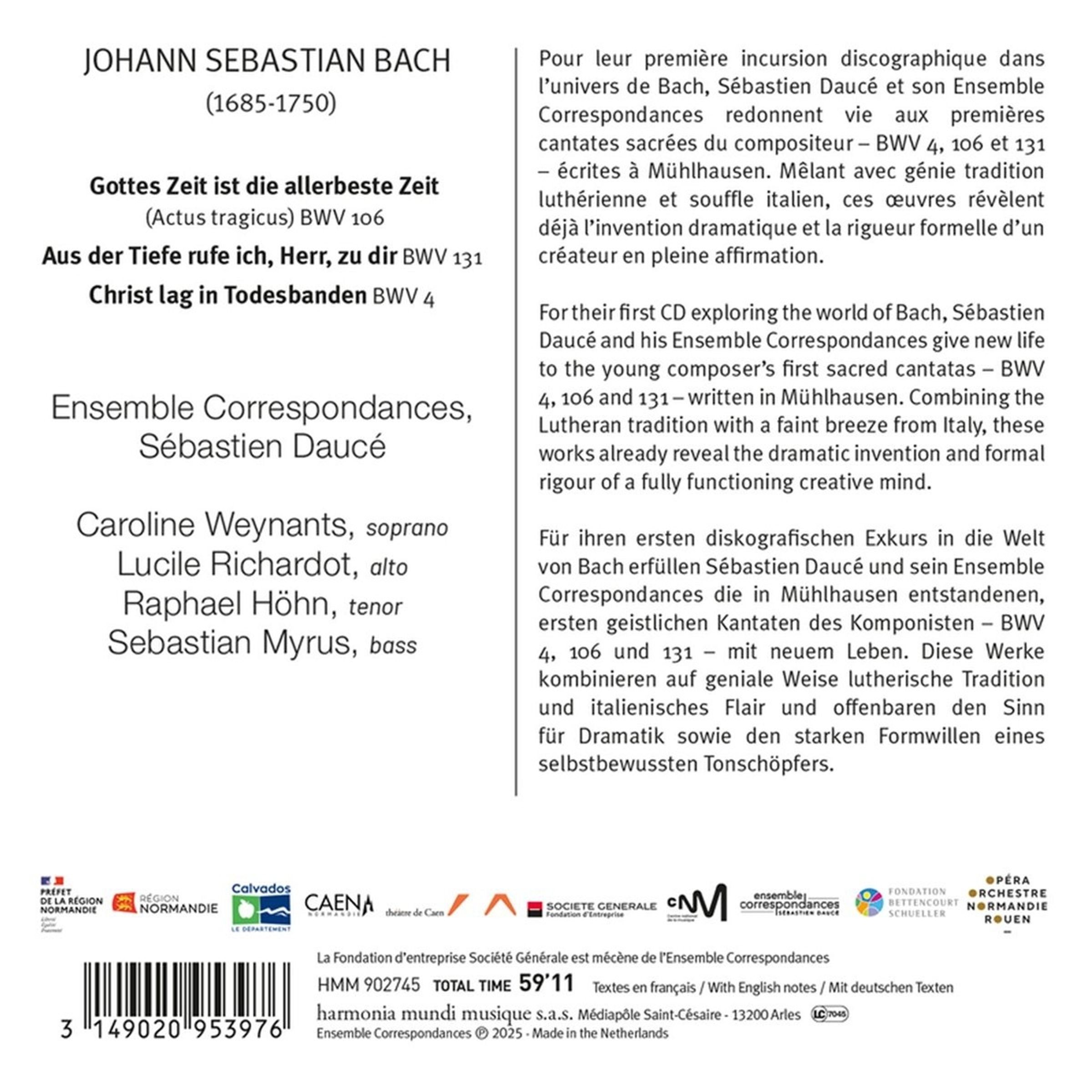 BWV 4 "Christ lag in Todesbanden"; BWV 106 (Actus tragicus) "Gottes Zeit ist die allerbeste Zeit"; BWV 131 "Aus der Tiefe rufe ich, Herr, zu dir"