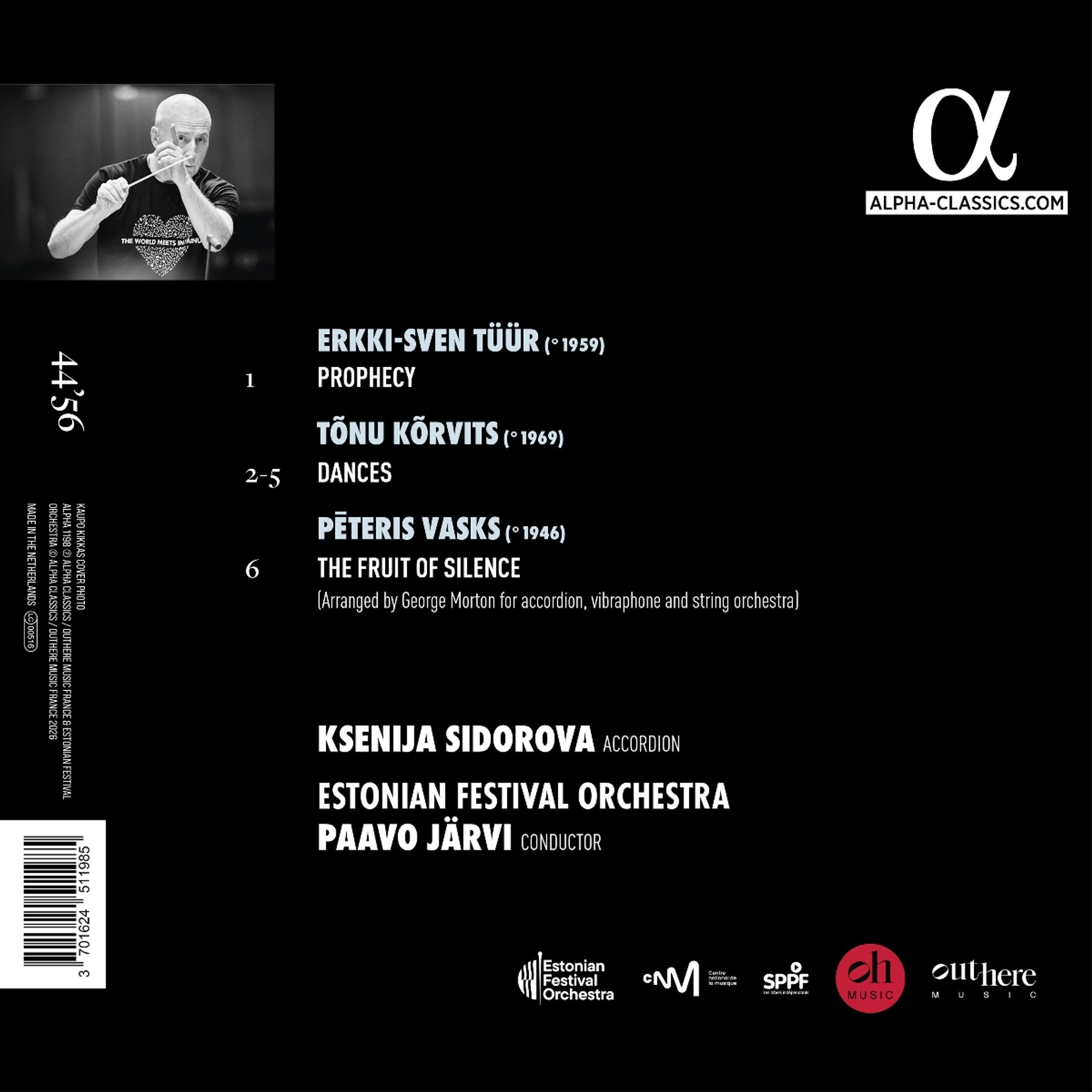 Mit diesen Werken für Akkordeon und Orchester würdigen Ksenija Sidorova und Paavo Järvi die Musik der baltischen Länder: Die Lettin und der Este, die seit über 10 Jahren zusammenarbeiten, nahmen in Pärnu mit dem von Paavo gegründeten Festivalorchester auf, einem luxuriösen Ensemble, das sich aus den besten Musikern der größten europäischen Orchester zusammensetzt. Erkki-Sven Tüürs 2007 komponiertes Konzert mit dem Titel Prophecy beschäftigt sich mit dem Konzept des Sehers, einer Person, die die Zukunft sehen kann, aber oft von der Gesellschaft, in der sie lebt, verachtet wird. Das Konzert nutzt die gesamte Kraft und Bandbreite des Sinfonieorchesters in völliger Verbindung mit dem Solisten: „Es ist das technisch komplizierteste Werk, das ich je gespielt habe!”, sagt Ksenija. Das Konzert „Dances” eines anderen estnischen Komponisten, Tõnu Kõrvits, wurde für Sidorova geschrieben und 2024 in Pärnu uraufgeführt. Der Komponist wollte sich für sein Werk ganz in die Akkordeonmusik vertiefen und lernte sogar, dieses Instrument zu spielen ... er entlockte ihm einige noch nie dagewesene Klänge. The Fruit of Silence ist das Werk von Ksenijas Landsmann Pēteris Vasks. Er arrangierte eines seiner Stücke für Chor und Klavier, basierend auf den Worten von Mutter Teresa.