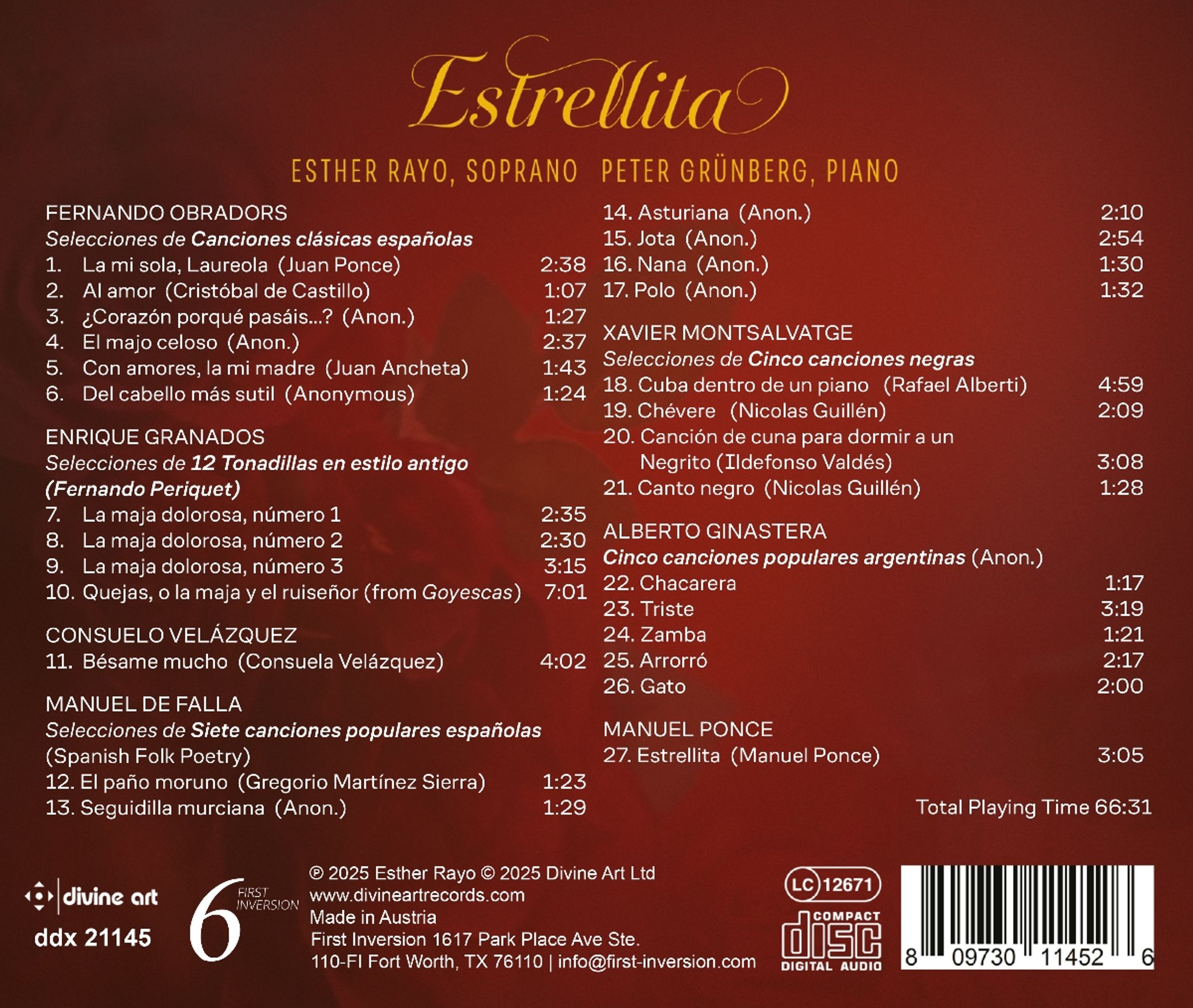 Die lyrische Sopranistin Esther Rayo und der renommierte Pianist und Dirigent Peter Grünberg präsentieren eine Sammlung sinnlicher klassischer spanischer Lieder für Gesang und Klavier. Dieses Programm wurde erstmals in einer Konzertreihe der in San Francisco ansässigen Lehr- und Aufführungsorganisation LIEDER ALIVE! aufgeführt. Das Album enthält Lieder von spanischsprachigen Komponisten des frühen 20. Jahrhunderts: Fernando Obradors, Manuel de Falla, Enrique Granados, Alberto Ginastera, Xavier Montsalvatge, Consuelo Velázquez und Manuel Ponce. Diese lebendigen Liederzyklen, die sich an der klassischen spanischen Poesie und regionalen Volksmelodien orientieren, sprechen sowohl Liebhaber des Kunstliedes als auch Ersthörer an. Der in Kalifornien geborene Esther Rayo, die von spanischer Musik und Sprache umgeben aufwuchs, liegt diese Musik besonders am Herzen. Ihre professionelle Verbindung zu diesen Liedern begann, als sie während ihres Studiums mit der Musik von Manuel Obradors in Berührung kam. Obradors bot ihr den perfekten Ausgangspunkt für ihr weiteres Forschen und so entdeckte sie das spanische Kunstlied für sich. Große Sopranistinnen des 20. Jahrhunderts, wie Montserrat Caballé und Victoria de los Angeles, die diese Musik am Leben erhielten, inspirierten sie. Während ihres Studiums im Jahr 2017 lernte Rayo Peter Grünberg kennen, und sie fanden sofort eine musikalische Verbindung über die Werke spanischsprachiger Komponisten. LIEDER ALIVE! half Rayo und Grünberg dabei, diese Musik gemeinsam aufzuführen, neben seiner eigentlichen Mission, deutsche Lieder zu fördern. Im Laufe der Jahre erarbeiteten sie immer mehr klassisches spanisches Repertoire, und so kam es schließlich zu diesem gemeinsamen Debütalbum. Und selbst nach all dieser Zeit haben sie immer noch das Gefühl, nur einen Bruchteil dieses wunderbaren Repertoires entdeckt zu haben!