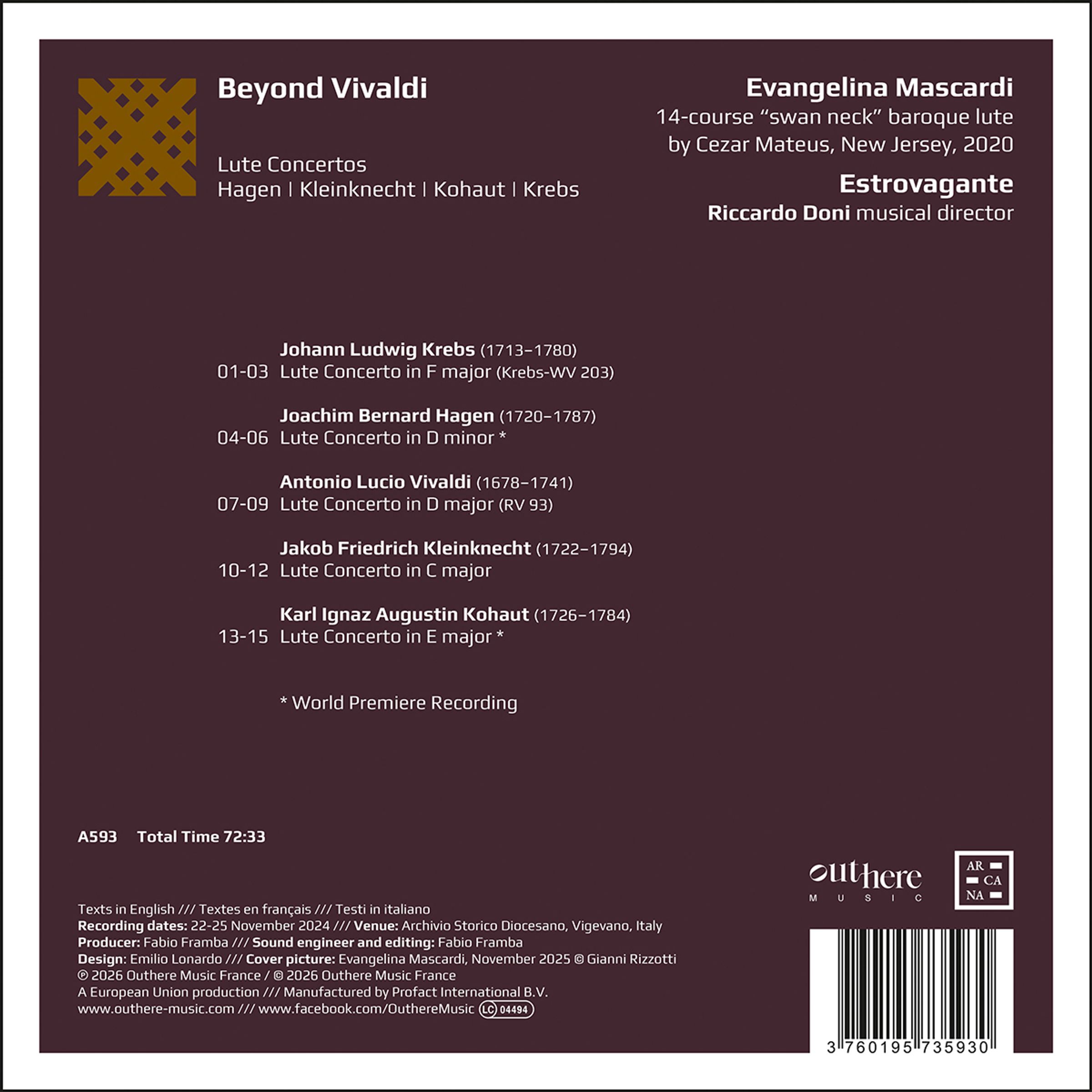 Das Konzert für Laute RV 93, komponiert während Antonio Vivaldis Aufenthalt in Prag in den Jahren 1729-30, ist das berühmteste Beispiel für ein Repertoire, das heute fast völlig vernachlässigt wird, aber einst im deutschsprachigen Raum, insbesondere in den Habsburger Ländern Österreich und Böhmen, äußerst beliebt war. Nachdem Evangelina Mascardi uns eine Referenzausgabe der gesamten Werke von Johann Sebastian Bach (2022) und eine repräsentative Anthologie des Schaffens von Silvius Leopold Weiss (2024) vorgelegt hat, schließt sie ihre Trilogie zum 18. Jahrhundert ab, indem sie ein grundlegendes, aber bisher weitgehend vernachlässigtes Kapitel der Geschichte der Laute beleuchtet. Neben dem Vivaldi-Konzert, das Gitarristen seit den frühen 1960er Jahren zu einem seiner meistgefeierten Werke gemacht haben, finden wir vier echte und praktisch unbekannte Juwelen, wie die von Joachim Bernard Hagen und Karl Ignaz Augustin Kohaut komponierten, die nun erstmals aufgenommen wurden. Begleitet vom Estrovagante-Orchester unter der Leitung von Riccardo Doni wagt sich Mascardi an die Rokoko-Sprache, den stilistischen Kontext für die letzten virtuosen Meisterwerke eines Instruments, das auf eine reiche Geschichte zurückblicken kann, aber innerhalb weniger Jahre endgültig in Vergessenheit geraten sollte.