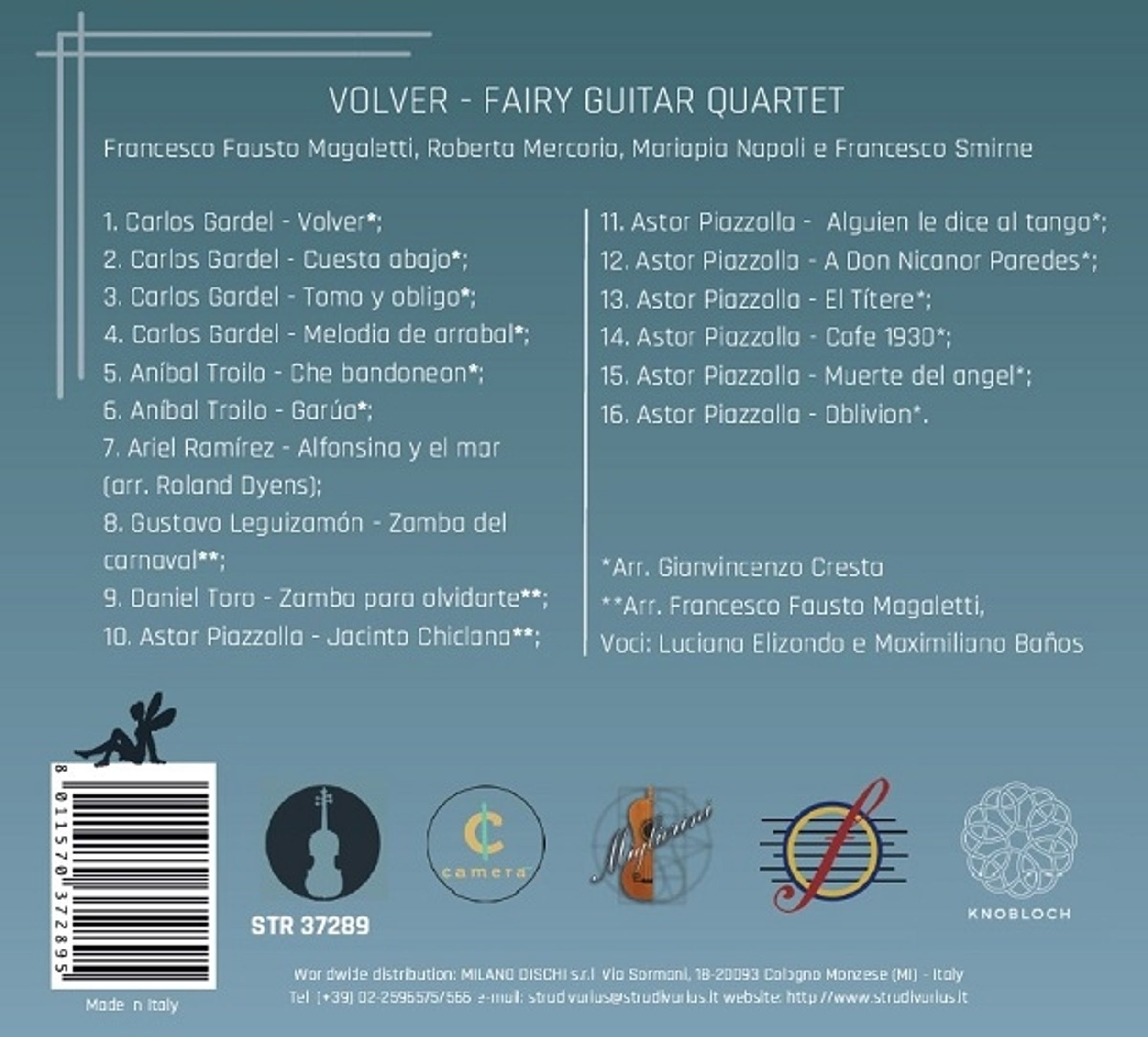 Auf diesem neuen Album ist das Fairy Guitar Quartet zu hören, eine Gruppe, die 2020 von vier Gitarristen gegründet wurde, die eine große Leidenschaft für Kammermusik verbindet. Volver, ihr Debütalbum, erkundet das große argentinische Musikrepertoire mit einem neuen Forschungsansatz und bietet eine eindrucksvolle musikalische Reise, die die Verbindungen zwischen Italien und Südamerika hervorhebt und es dem Hörer ermöglicht, intensive Gefühle zu erleben und wiederzuentdecken. In einer Geschichte von ständigem Aufbruch und Wiederkehr tauchen komplexe Gefühle auf - Kapitel, die von einer großen suggestiven Kraft durchdrungen sind und zu einem gemeinsamen kulturellen Erbe gehören. Dieses Album bietet eine wertvolle Gelegenheit, eine Welt voller Charme wiederzuentdecken, die die kreativen Überschneidungen verschiedener Kulturen (afrikanische, indigene, spanische und italienische) widerspiegelt. Im Mittelpunkt des Hörerlebnisses steht das Thema von Volver, das sowohl in der italienischen als auch in der argentinischen Kultur und in der südlichen Hemisphäre einen tiefen Widerhall findet: die Traurigkeit über die Trennung von dem, was man liebt, und die Hoffnung auf die Wiederentdeckung der eigenen Wurzeln.