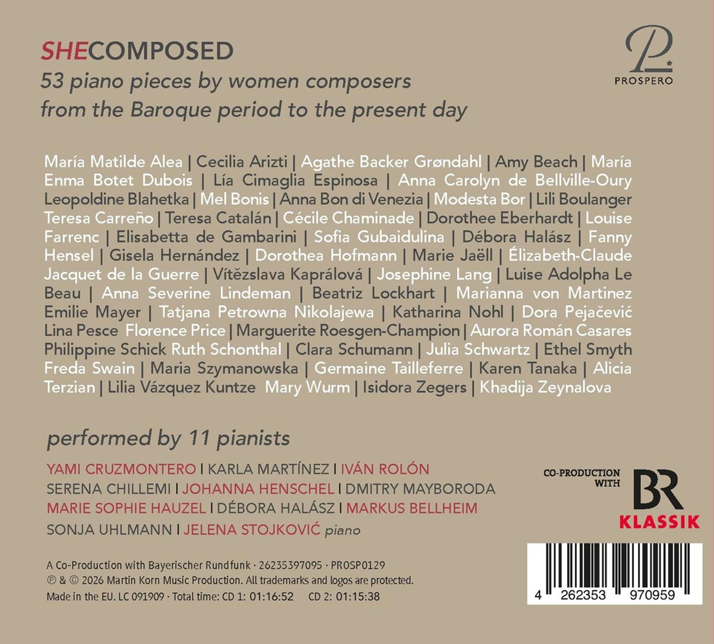 Mit Werken von: Florence Price (1887-1953) , Maria Matilde Alea (1918-2006) , Dorothee Eberhardt (geb. 1952) , Lilia Vazquez Kuntze (geb. 1955) , Emilie Mayer (1812-1883) , Teresa Carreno (1853-1917) , Isadora Zegers (1803-1869) , Elisabeth-Claude Jacquet de la Guerre (1665-1729) , Mary Wurm (1860-1938) , Elisabetta de Gambarini (1731-1765) , Freda Swain (1902-1985) , Ethel Smyth (1858-1944) , Anna Severine Lindeman (1859-1938) , Germaine Tailleferre (1892-1983) , Dora Pejacevic (1885-1923) , Louise Farrenc (1804-1875) , Tatjana Nikolajewa (1924-1993) , Khadija Zeynalova (geb. 1975) , Amy Beach (1867-1944) , Maria Emma Botet Dubois (1903-1987) , Debora Halasz (2. Hälfte 20. Jahrhundert) , Marie Jaell (1846-1925) , Anna Bon di Venezia (1738-1767) , Vitezslava Kapralova (1915-1940) , Marguerite Roesgen-Champion (1894-1976) , Teresa Catalan (geb. 1951) , Katharina Nohl (geb. 1973) , Luise Adolpha le Beau (1850-1927) , Cecilia Arizti (1856-1930) , Modesta Bor (1926-1998) , Maria Szymanowska-Wolowska (1789-1831) , Ruth Schonthal (1924-2006) , Julia Schwartz (geb. 1963) , Sofia Gubaidulina (1931-2025) , Aurora Roman Casares (geb. 1933) , Josephine Lang (1815-1880) , Anna Carolyn Belleville-Oury (1806-1880) , Lina Pesce (1913-1995) , Karen Tanaka (geb. 1961) , Gisela Hernandez (1912-1971) , Alicia Terzian (geb. 1934) , Clara Schumann (1819-1896) , Marianna von Martinez (1744-1812) , Fanny Mendelssohn-Hensel (1805-1847) , Leopoldine Blahetka (1809-1885) , Lili Boulanger (1893-1918) , Agathe Backer-Gröndahl (1847-1907) , Melanie (Mel) Bonis (1858-1937) , Cecile Chaminade (1857-1944) , Philippine Schick (1893-1970) , Beatriz Lockhart (1944-2015) , Lia Cimaglia Espinosa (1906-1998) , Dorothea Hofmann (geb. 1961) und weitere