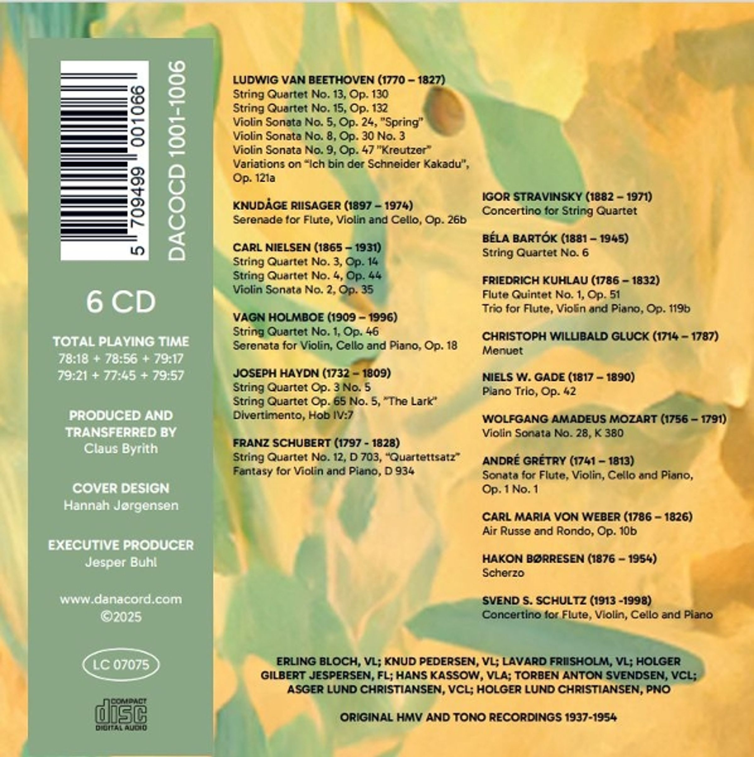 Bela Bartok, Erling Bloch, Ludwig van Beethoven, Asger Lund Christiansen, Hakon Börresen, Lavard Friisholm, Niels Wilhelm Gade, Holger Gilbert-Jespersen, Christoph Willibald Gluck, Hans Kassow, Andre Modeste Gretry, Holger Lund-Christiansen, Joseph Haydn, Knud Pedersen, Vagn Holmboe, Torben Anton Svendsen, Friedrich Kuhlau, Wolfgang Amadeus Mozart, Carl Nielsen, Knudage Riisager, Fran Schubert