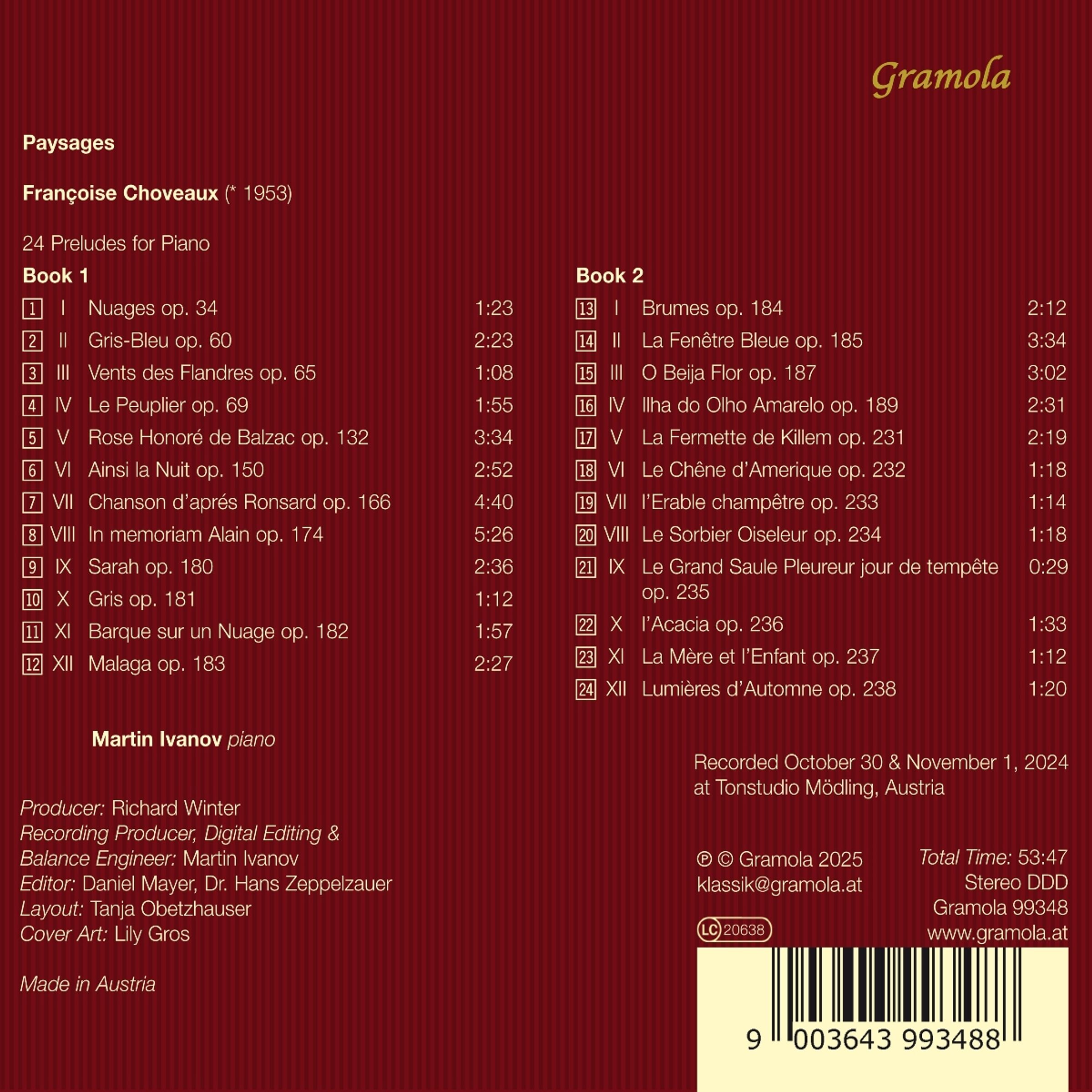 Françoise Choveaux studierte am Konservatorium von Lille, an der Ecole Normale de Musique in Paris, am Peabody Institute in Baltimore und anschließend an der Juilliard School in New York. Sie ist Komponistin, aber auch Pianistin, und knüpft an eine bis ins 19. Jahrhundert reichende Musiktradition an. Nach ihrer Rückkehr von der Juilliard School nach Frankreich im Jahr 1981 ließ sich Françoise Choveaux in einem kleinen Bauernhaus in Killem nieder, umgeben von den windgepeitschten Feldern in Ostflandern. Die kraftvolle Natur und die weiten Landschaften sind ein wesentlicher Bestandteil ihres Lebens, und so ist jede ihrer Partituren entweder von Reisen oder inneren Emotionen inspiriert oder steht in direktem Zusammenhang mit einem literarischen oder bildnerischen Werk. Die von dem bulgarischen, in Wien lebenden Pianisten Martin Ivanov interpretierten 24 Préludes für Klavier mit dem Titel „Paysages“ (Landschaften) entstanden zwischen 1981 und 2024 und sind Liebeslieder an die Natur, inspiriert von den erdigen Elementen Flanderns; sie beschreibt den Himmel, der von starken, kontrastreichen Winden heimgesucht wird, den strahlenden Himmel, die schwarze, fruchtbare Erde.