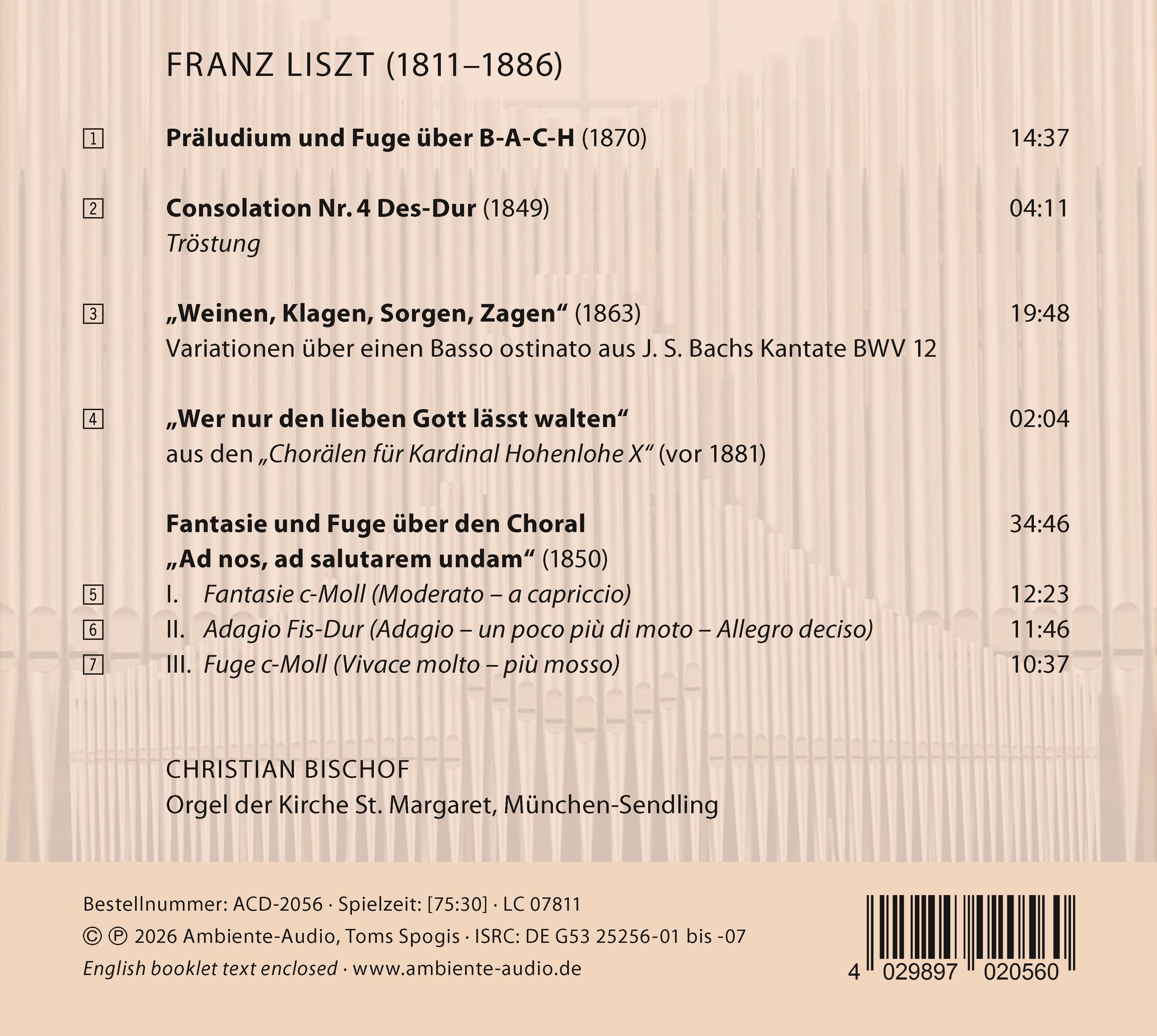 Präludium & Fuge über BACH; Consolation Nr. 4 Des-Dur; Variationen über "Weinen, Klagen, Sorgen, Zagen2; Fantasie & Fuge über "Ad nos, ad salutarem undam"