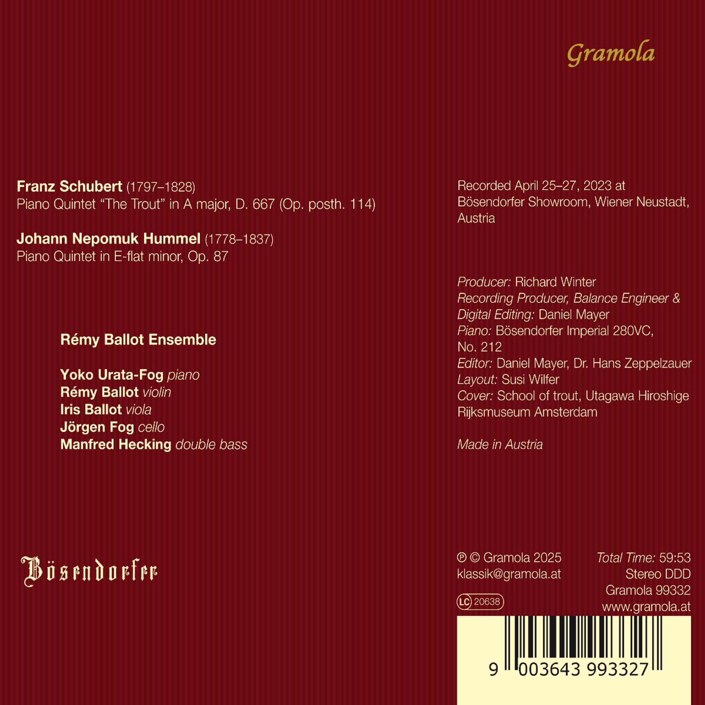 Das Klavierquintett um den Violinisten und Dirigenten Rémy Ballot stellt auf dieser Einspielung Franz Schuberts berühmtes Forellenquintett dem beinahe 20 Jahre zuvor komponierten, weit seltener gehörten Klavierquintett von Johann Nepomuk Hummel gegenüber. Beiden Quintetten gemein ist (neben dem Umstand, dass sie jeweils nach Fertigstellung etliche Jahre unveröffentlicht blieben) die damals noch übliche Besetzung mit Kontrabass, der im späteren Verlauf der Musikgeschichte fast regelmäßig durch eine zweite Violine ersetzt wurde. Yoko Urata-Fog, Klavier, Rémy Ballot, Violine, Iris Ballot, Viola, Jörgen Fog, Violoncello und Manfred Hecking, Kontrabass beeindrucken dabei mit kompromissloser Musikalität und uneitlem Spiel, welches die vielfältigen Klangebenen einzigartig, fast analytisch zum Vorschein bring, und beweisen damit, dass trotz vieler dutzend Aufnahmen der „Forelle“ noch Substanzielles zur Interpretationsgeschichte beizutragen ist.