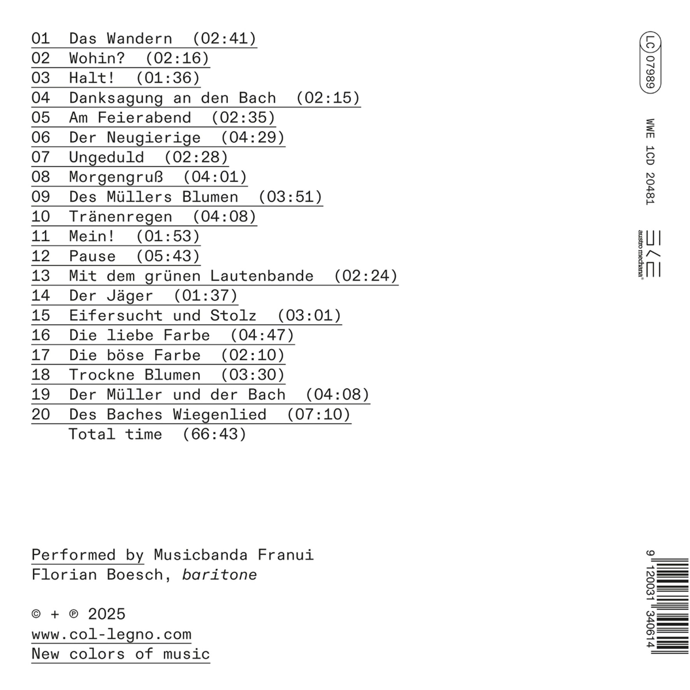 Anders als die Winterreise und die Liederkreise von Schumann erzählt Schuberts erste große Liedersammlung eine Geschichte: Ein junger Wandersmann verliebt sich in die schöne Tochter des Müllers und muss schließlich erkennen, dass ihm der fesche Jäger vorgezogen wird. Abweichend von der geläufigen Interpretation nimmt der Wanderer in der vorliegenden Deutung sich nicht das Leben. Der Weltschmerz-Schubert ist eben auch nicht unbedingt weiter vom Klischee entfernt als der Ländler-Franz, dem die Nachwelt ein intaktes Verhältnis zu Heimat, Natur und Liebe andichtete. Solchen Vorannahmen gehen Boesch und die Franuis aus dem Weg. Eine Kritikerin hörte in Berlin »frappierende Rhythmen« und Anklänge an Weill, Klezmer und die musikalische Moderne. In einer anderen Kritik war die Rede von einem »Kammerspiel im Geisterreich«. Der Dialog mit dem Geist und im Geiste Schuberts lässt sich auf dieser Aufnahme nun als Hörtheater nacherleben.