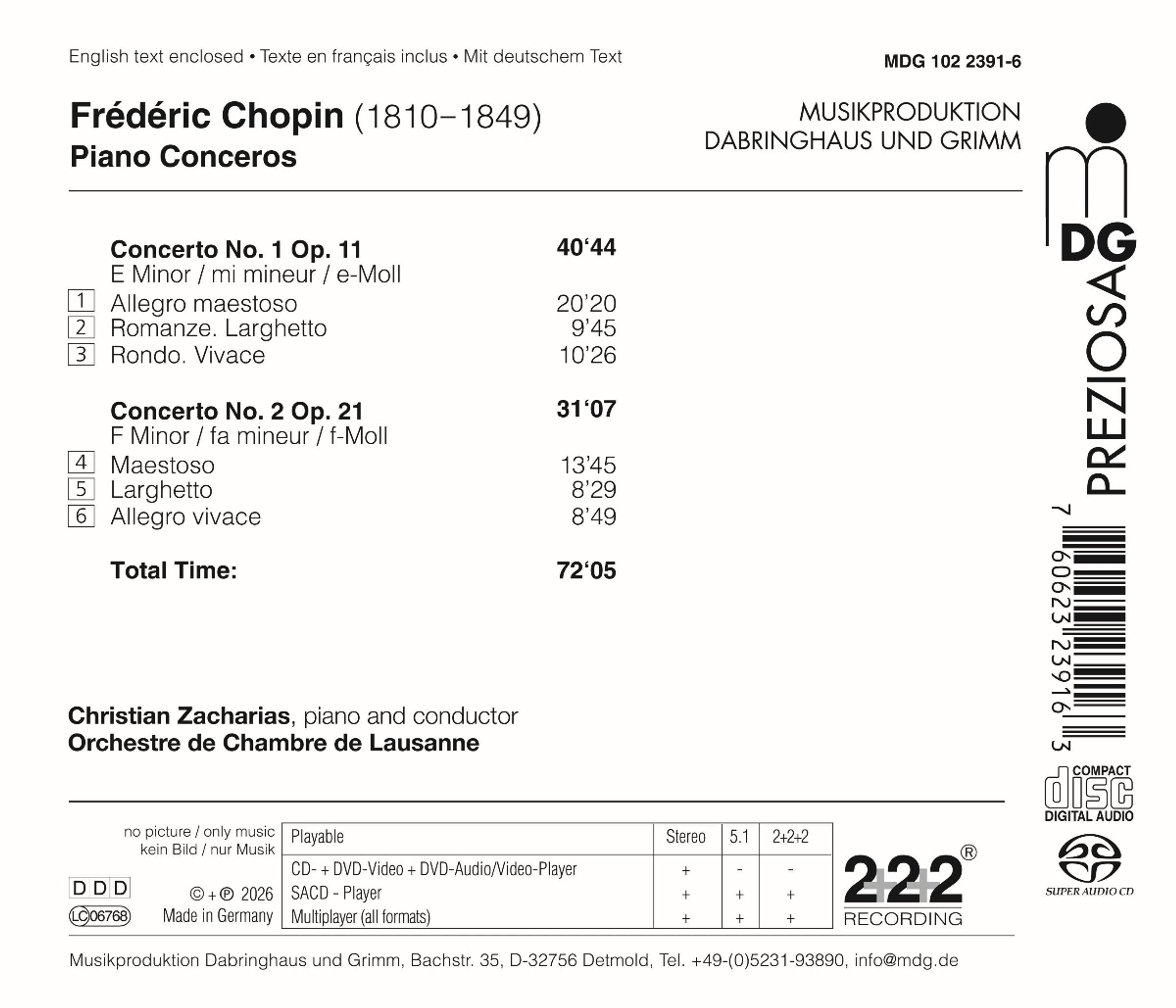 Eine glücklichere Verbindung von Poesie und Virtuosität ist kaum vorstellbar: Der 20-jährige Frédéric Chopin hatte die beiden Konzerte noch in Warschau für sein umjubeltes Debüt in Paris komponiert. Und Christian Zacharias versteht es wie kein anderer, die intimen und extrovertierten Momente dieser Musik zum Leuchten zu bringen. In MDGs »Preziosa«-Reihe sind Chopins Klavierkonzerte frisch aufgelegt, neu abgemischt und fein gemastert nun erstmals auf Super Audio CD erhältlich – für ein MDG-typisches Rundum-Wohlfühl-Klangerlebnis.