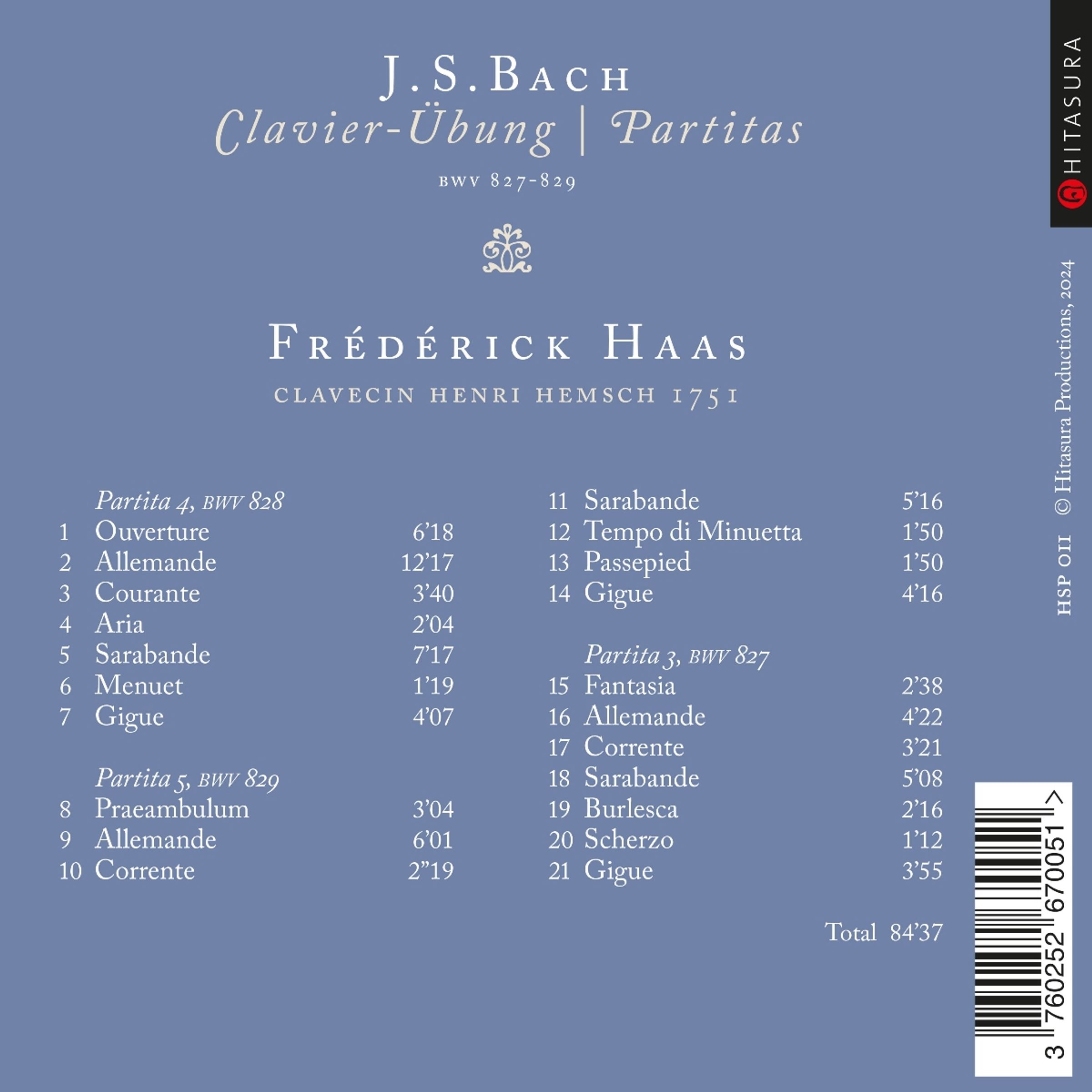 Frédérick Haas zu seiner Aufnahme: "J. S. Bachs erste Clavier-Übung - die Partiten - ist ein wichtiges Werk mit besonderem Status: Es ist die erste große Veröffentlichung eines großen Musikers auf dem Gipfel seiner Schaffenskraft - er war 46 - und bereits eine lebende Legende. Ein großer Teil der Herausforderung liegt im Widerspruch, dass eine Schwierigkeit den Eindruck von Mühelosigkeit vermitteln muss. Die Kunst muss die Kunst selbst verschleiern. Meine Absicht war es, die Partiten so zu spielen, wie ich sie gerne hören würde, so wie ich dachte, dass sie gehört werden könnten: hier ist also ein Vorschlag. Und wenn dieser Vorschlag den Wunsch weckt, sich weiter damit zu beschäftigen, ist mein Ziel erreicht." Der Pianist spielt die Partiten auf einem Cembalo von Henri Hemsch aus dem Jahr 1751.