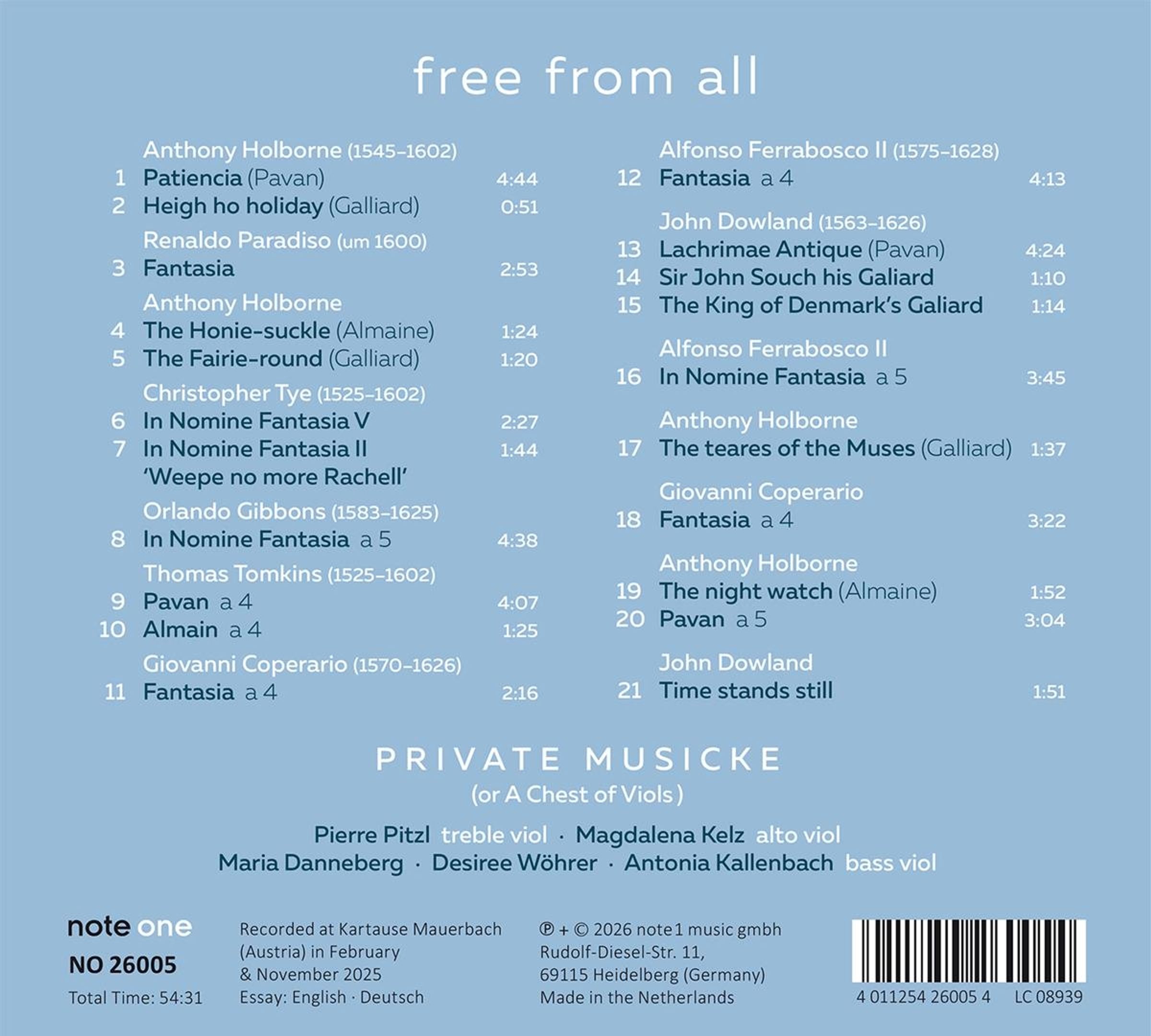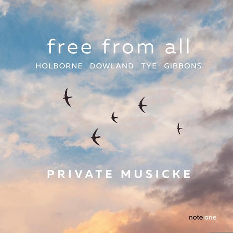 Der Klang eines Gambenconsort scheint schwebend leicht; seidig glänzend verbinden sich die Saitenklänge der in verschiedenen Lagen klingenden Gamben von Sopran bis Bass, fast schwerelos – free from all. Besonders beliebt war dieses Consort im England um 1600 und »a chest of viols« (eine Kiste mit einem Satz von verschiedenen Gamben) durfte in keinem Haushalt, der etwas auf sich hielt, fehlen. Die bedeutendsten englischen Komponisten schrieben herrliche Musik für diese Besetzung: Tanzsätze, Fantasien bis zu komplexen polyphonen Kompositionen und führten das Repertoire für Gambenconsort zu einem Höhepunkt. Die »chest of viols« des Ensemble Private Musicke hat Highlights der englischen Gambenmusik von Komponisten wie Holborne, Dowland, Ferrabosco II, Tye oder Coperario zusammengestellt und nimmt den Hörer mit auf eine Reise durch die Lüfte.
