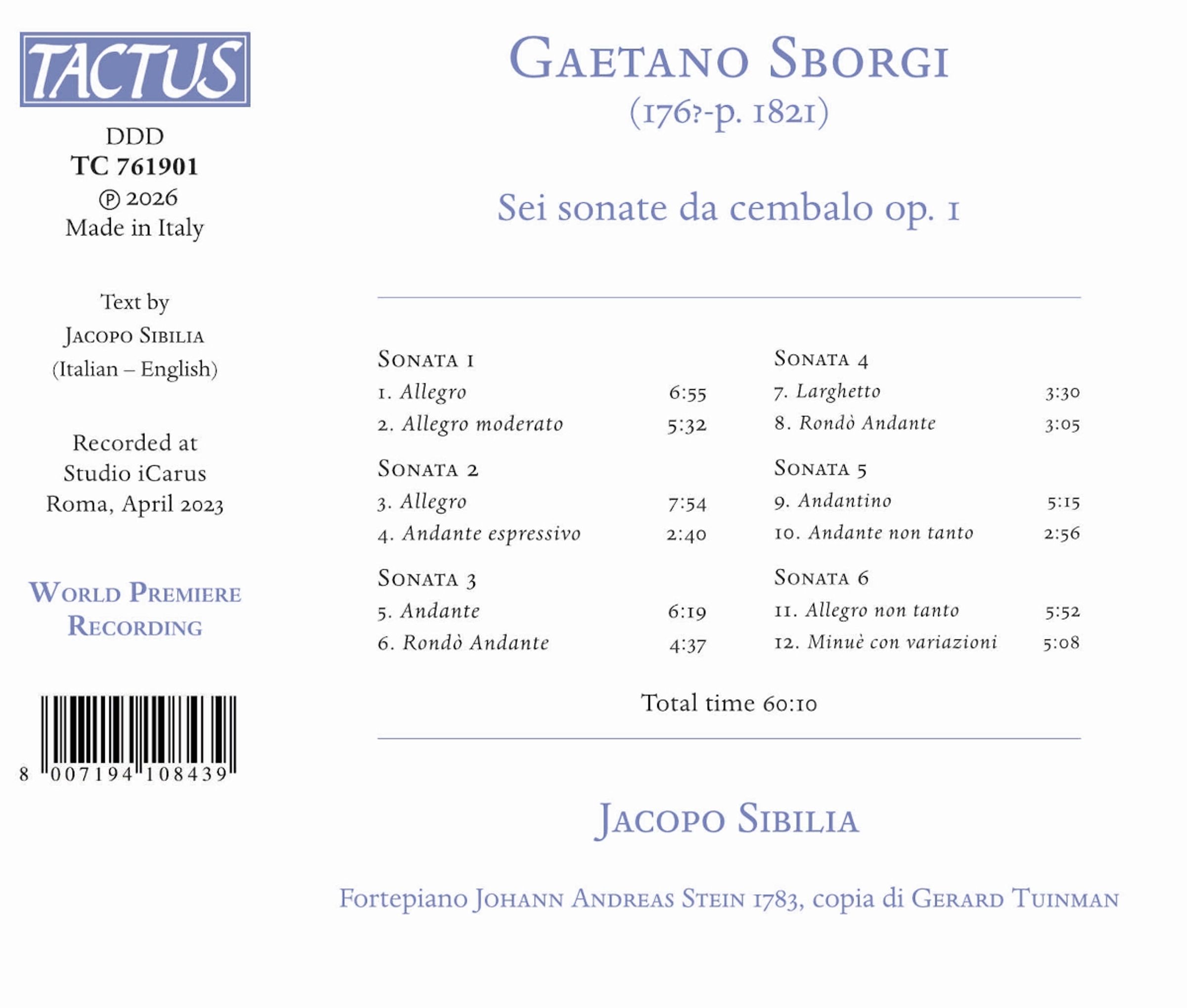 Das genaue Geburts- und Sterbedatum von Gaetano Sborgi, einem Komponisten, der zwischen der zweiten Hälfte des 18. und dem Beginn des 19. Jahrhunderts lebte, ist nicht bekannt. Mit ziemlicher Sicherheit lässt sich jedoch sagen, dass Sborgi in Florenz geboren wurde, da er im Vorwort seiner Sonaten angibt, Florentiner zu sein. Sborgi war Kapellmeister und Klavierlehrer an der Kaiserlichen Akademie der Schönen Künste in Florenz. Er studierte bei seinem Bruder (oder laut Picchianti bei seinem Vater) Gasparo und zog dann nach Neapel an das Konservatorium von S. Onofrio, wo er siebzehn Jahre lang blieb. Zurück in Florenz machte er sich mit mehreren Bühnenwerken einen Namen. Darüber hinaus gab er drei Bände mit Klaviersonaten heraus, die sein Können und Talent unter Beweis stellen. Die Cembalosonaten, die Lorenzo Niccolini, Kammerherr von Peter Leopold I. und Ferdinand III., gewidmet sind, können in den Kontext jener Kompositionen eingeordnet werden, die den allmählichen Übergang vom traditionellen Cembalo mit gezupften Saiten zum neuen Konzept des 'Piano et forte' mit angeschlagenen Saiten zeigen. Jacopo Sibilia verwendete für diese Aufnahmen eine Kopie eines Stein-Fortepianos von 1783, das mit zwei verschiedenen Mechaniken gespielt werden kann, um die Darbietung ausdrucksstarker und harmonischer zu gestalten.