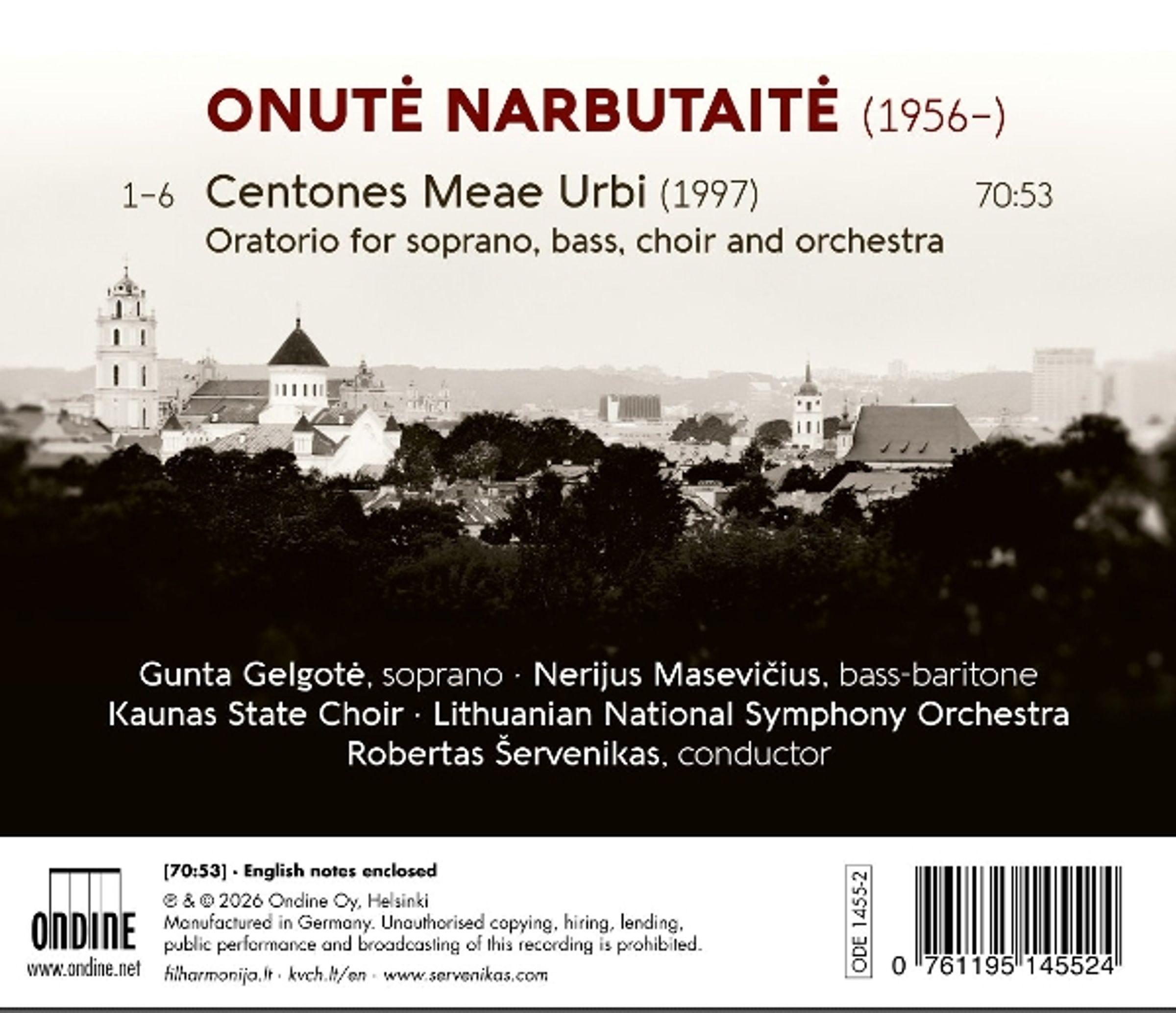 Onutė Narbutaitės Oratorium »Centones Meae Urbi« (1997) ist ein Schlüsselwerk der litauischen zeitgenössischen Musik und brachte der Komponistin den litauischen Nationalpreis ein. Diese neue Aufnahme aus dem Jahr 2024 mit Robertas Šervenikas als Dirigent des Litauischen Nationalen Symphonieorchesters, dem Kaunas State Choir und den litauischen Gesangssolisten Gunta Gelgotė und Nerijus Macevičius, ist eine wichtige Ergänzung der litauischen Musikaufnahmen. Die litauische Hauptstadt Vilnius ist ein Mosaik aus Kulturen, Musik und Sprachen. Diese Vielfalt findet ihren musikalischen Ausdruck in dem 70-minütigen mehrsprachigen Oratorium »Centones Maea Urbi«, einem Werk, das auch als endgültiger Durchbruch der Komponistin angesehen werden kann.