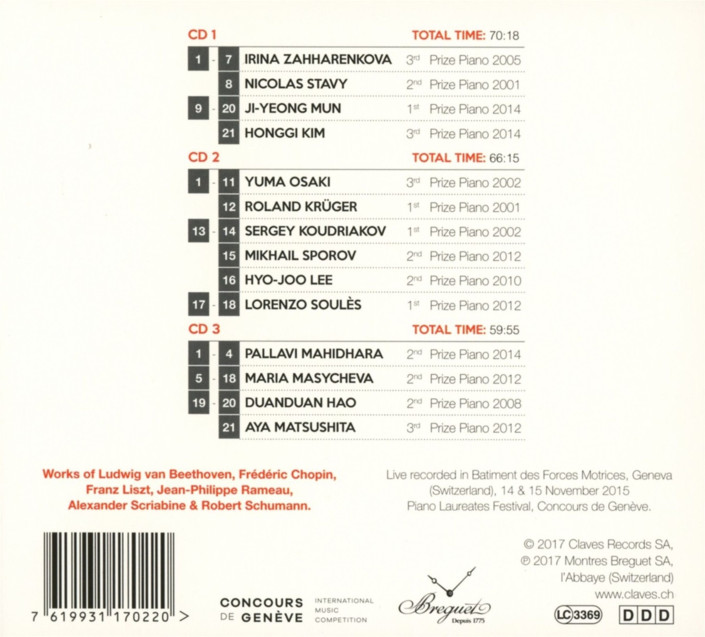 Seit 1939 besteht der längst international renommierte Genfer Klavierwettbewerb. Die Liveaufnahme enstand bei einem Preisträger-Konzert im November 2015.